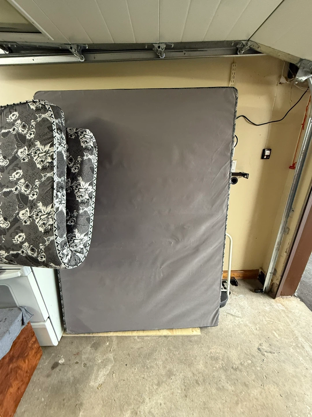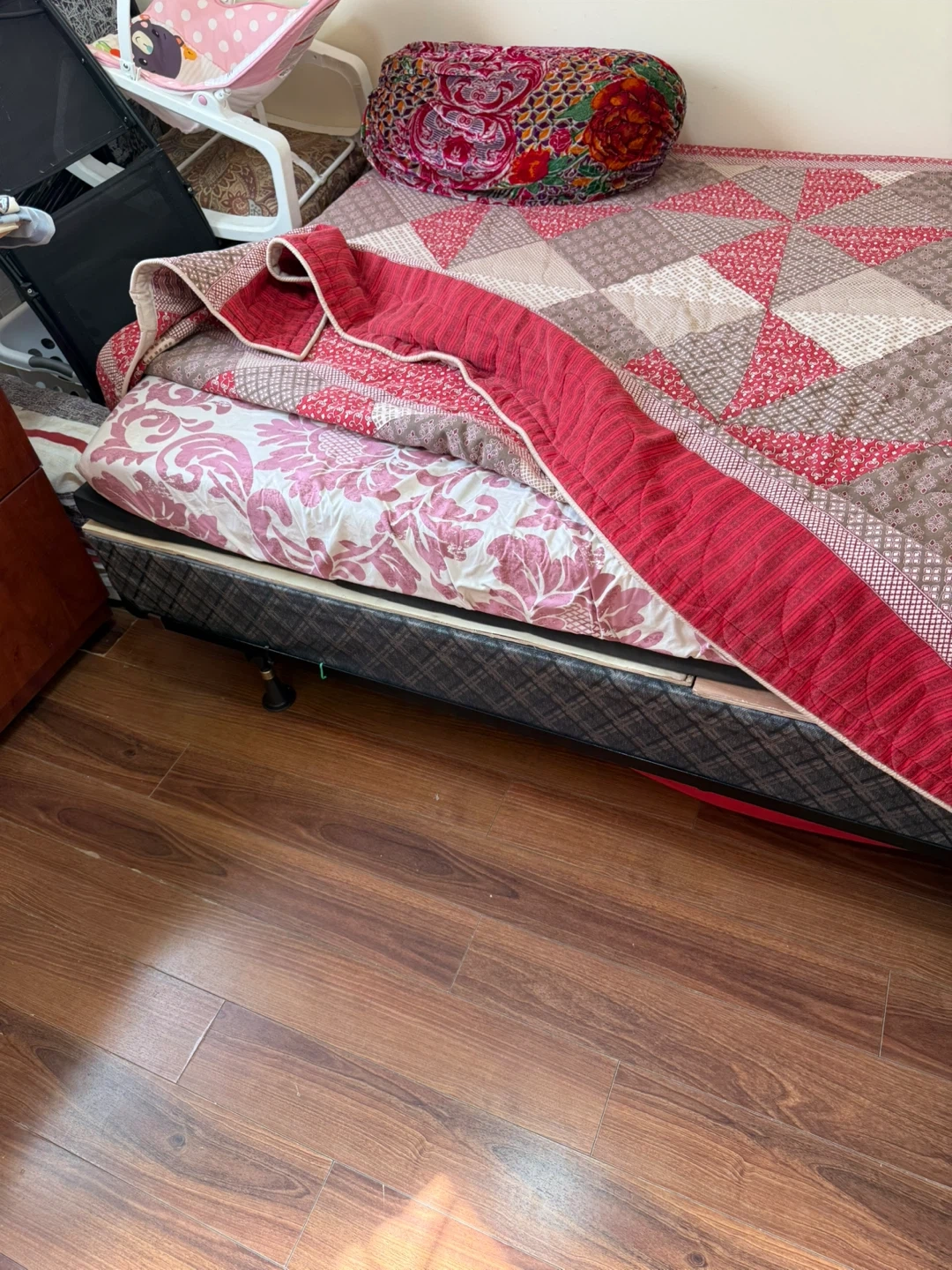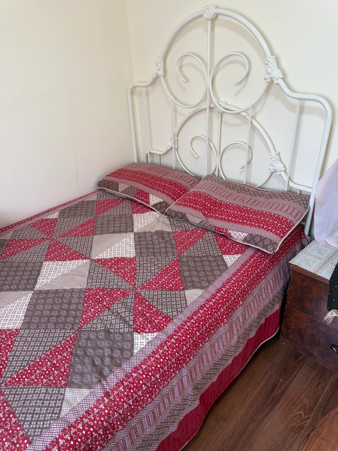 Selling a double size bed frame along with a mattress. The bed frame appears to be white metal with a decorative design. The mattress has a grey and white floral pattern on one side and a solid grey colour on the other. It's in good condition and ready for a new home!