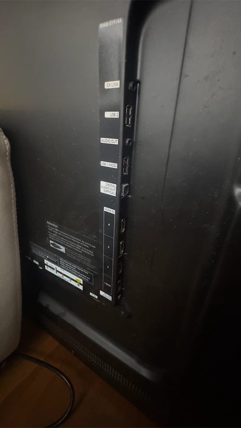 Selling a Samsung TV. It has multiple ports including EX-LINK, USB 2, AUDIO OUT, USB 1 (HDD), DIGITAL AUDIO OUT (OPTICAL), and multiple HDMI ports.