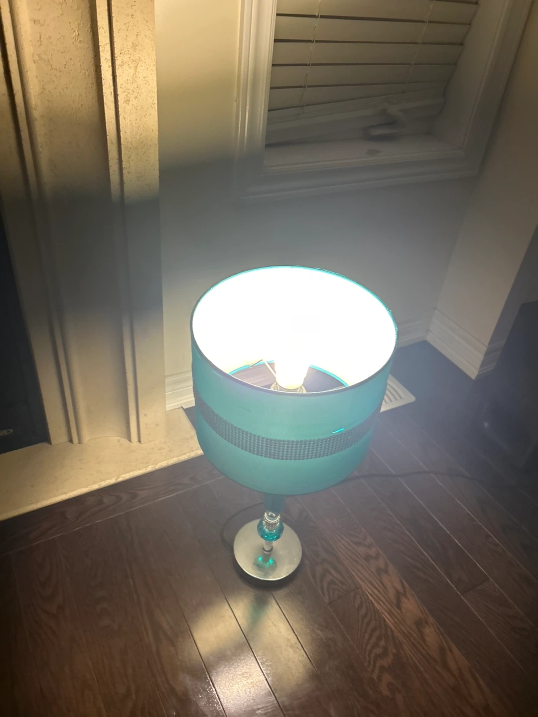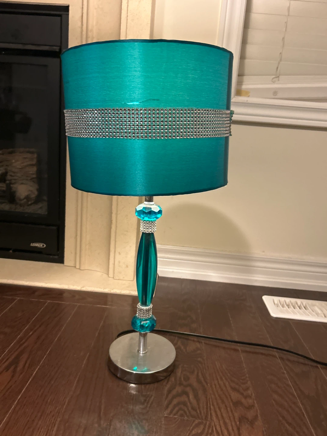 Here's a lovely teal table lamp that would look great in any room! The lamp features a decorative band and jewel accents. It's in great condition and ready to brighten up your space
