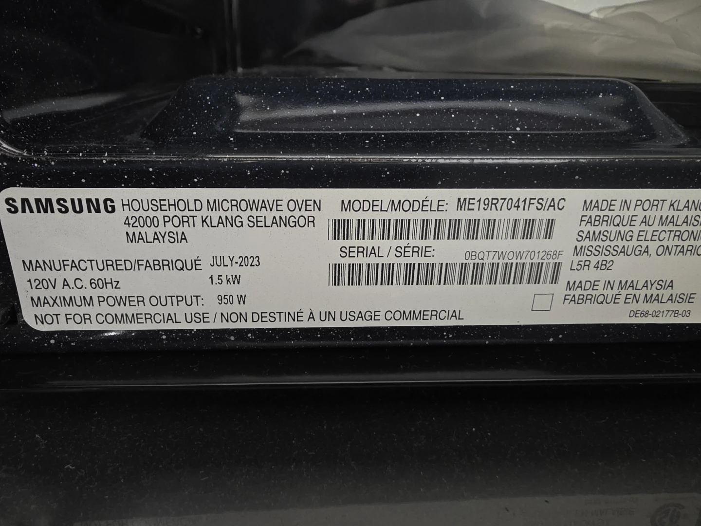 Selling a Samsung microwave oven, model number ME19R7041FS/AC. It's a household microwave oven with a maximum power output of 950W. Manufactured in July 2023.