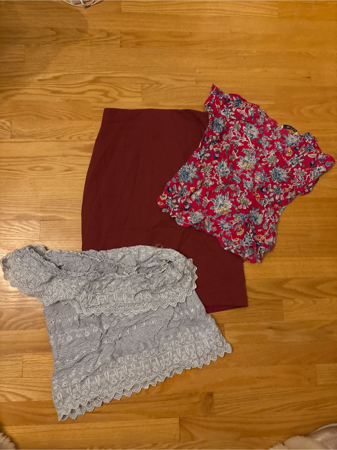 Selling a bundle of women's clothing. Includes a red high top skirt (fits like a size 2-4), a floral blouse (size small but fits medium), and a blue and white top (medium) All are in good condition and ready for a new home!