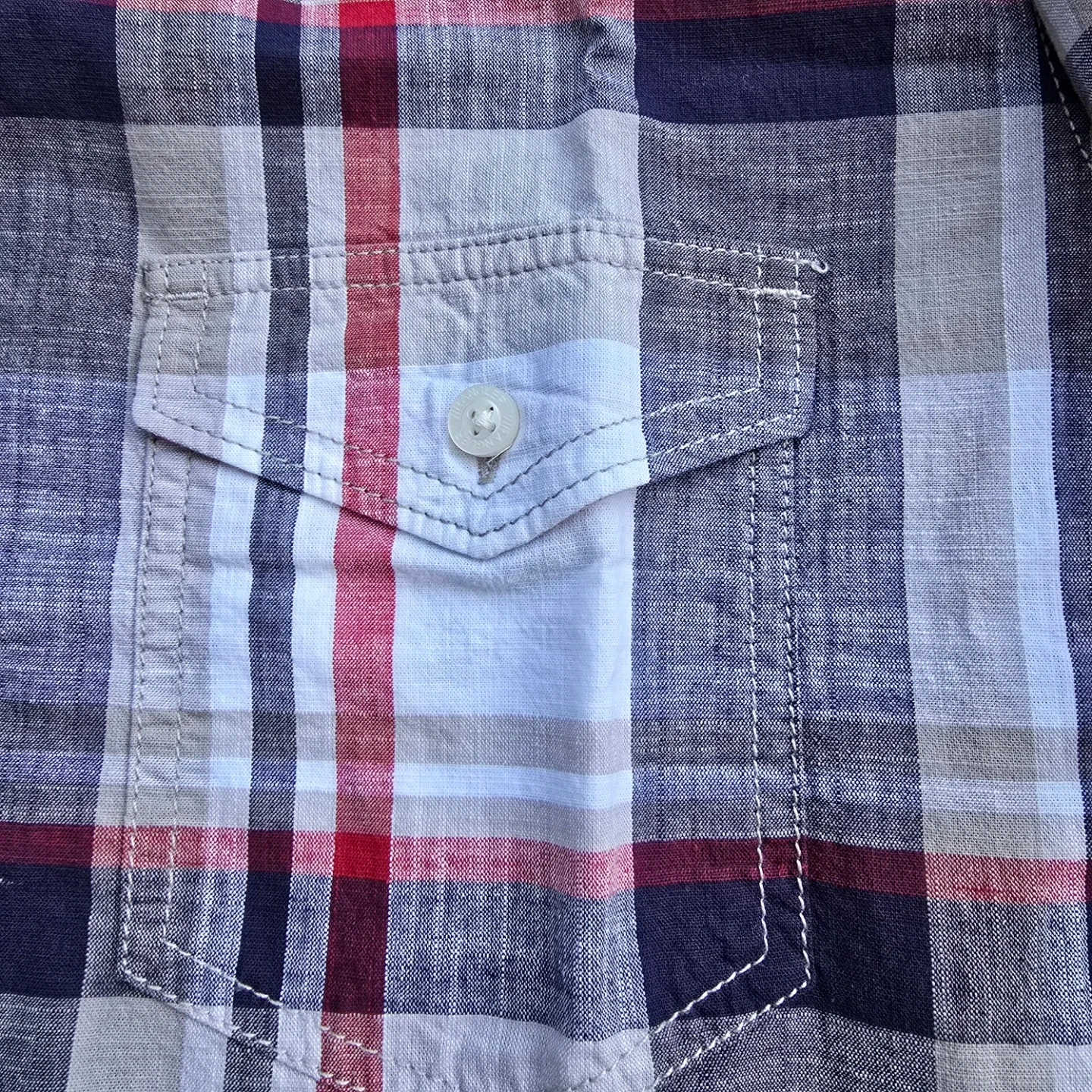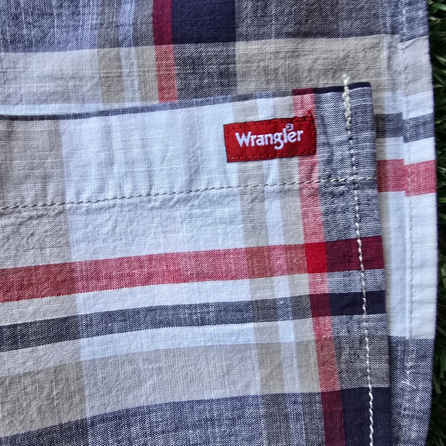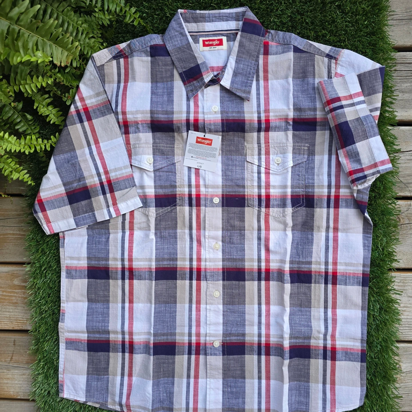 NEW with Tags! Wrangler Men's Cowboy Plaid Shirt. Featuring a classic red, blue, and white plaid pattern, short sleeve. This shirt offers both comfort and style. Perfect with denim jeans and boots or shorts. It features a classic plaid pattern in a mix of colours. Size Large.