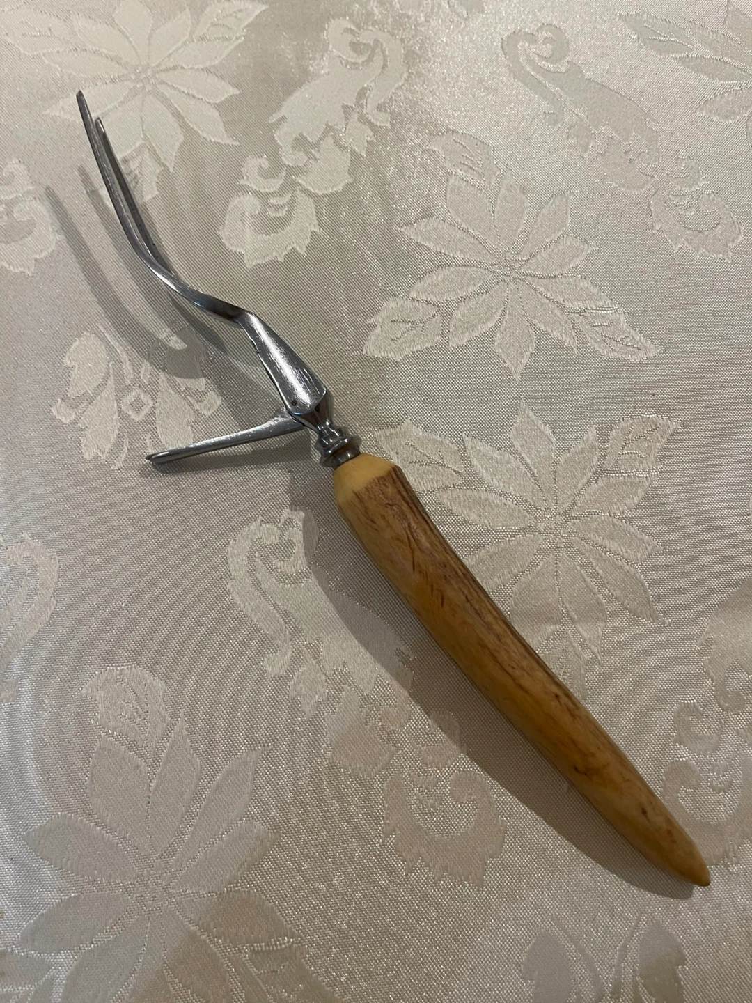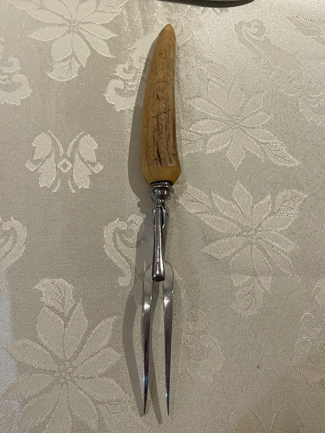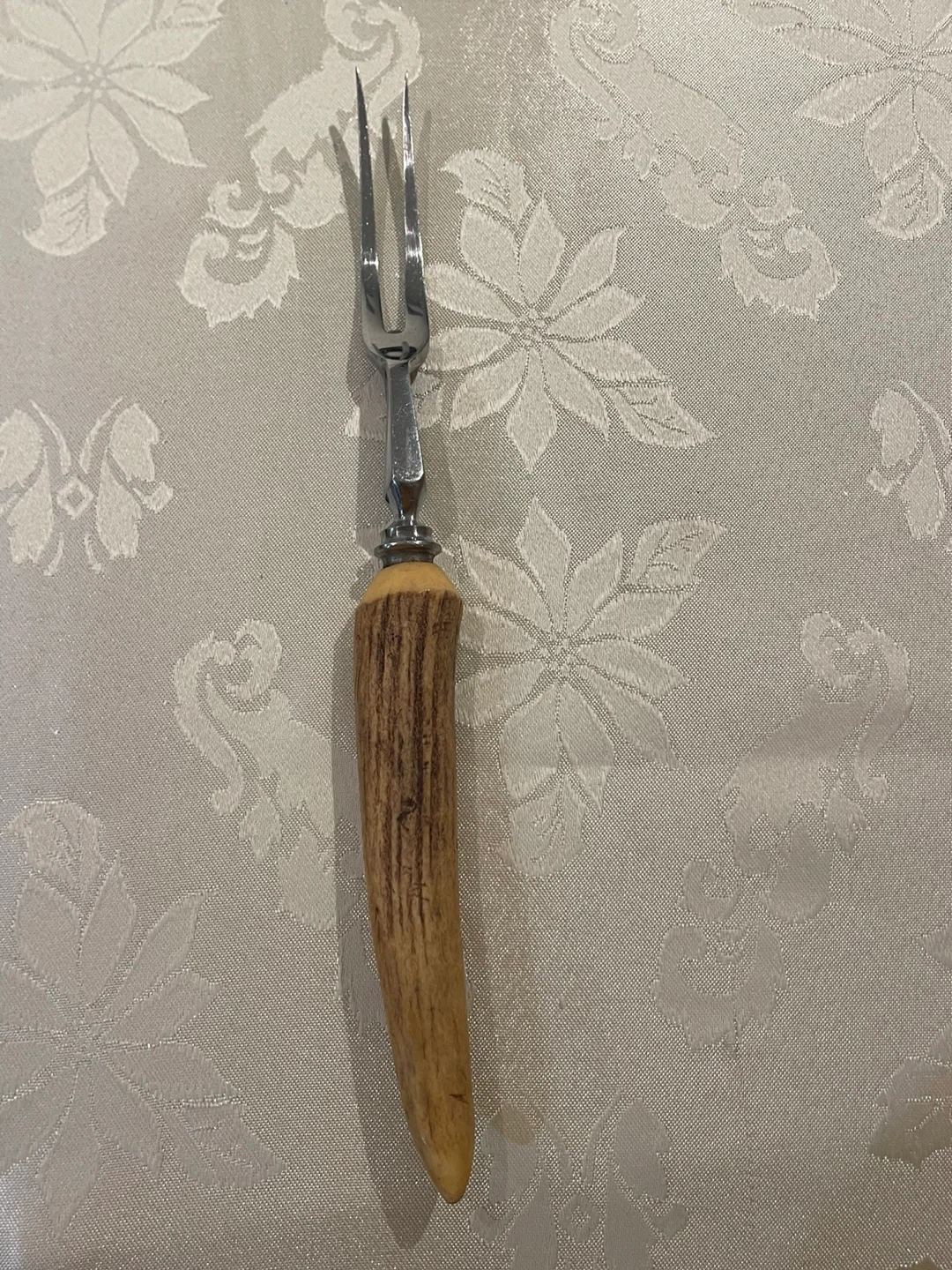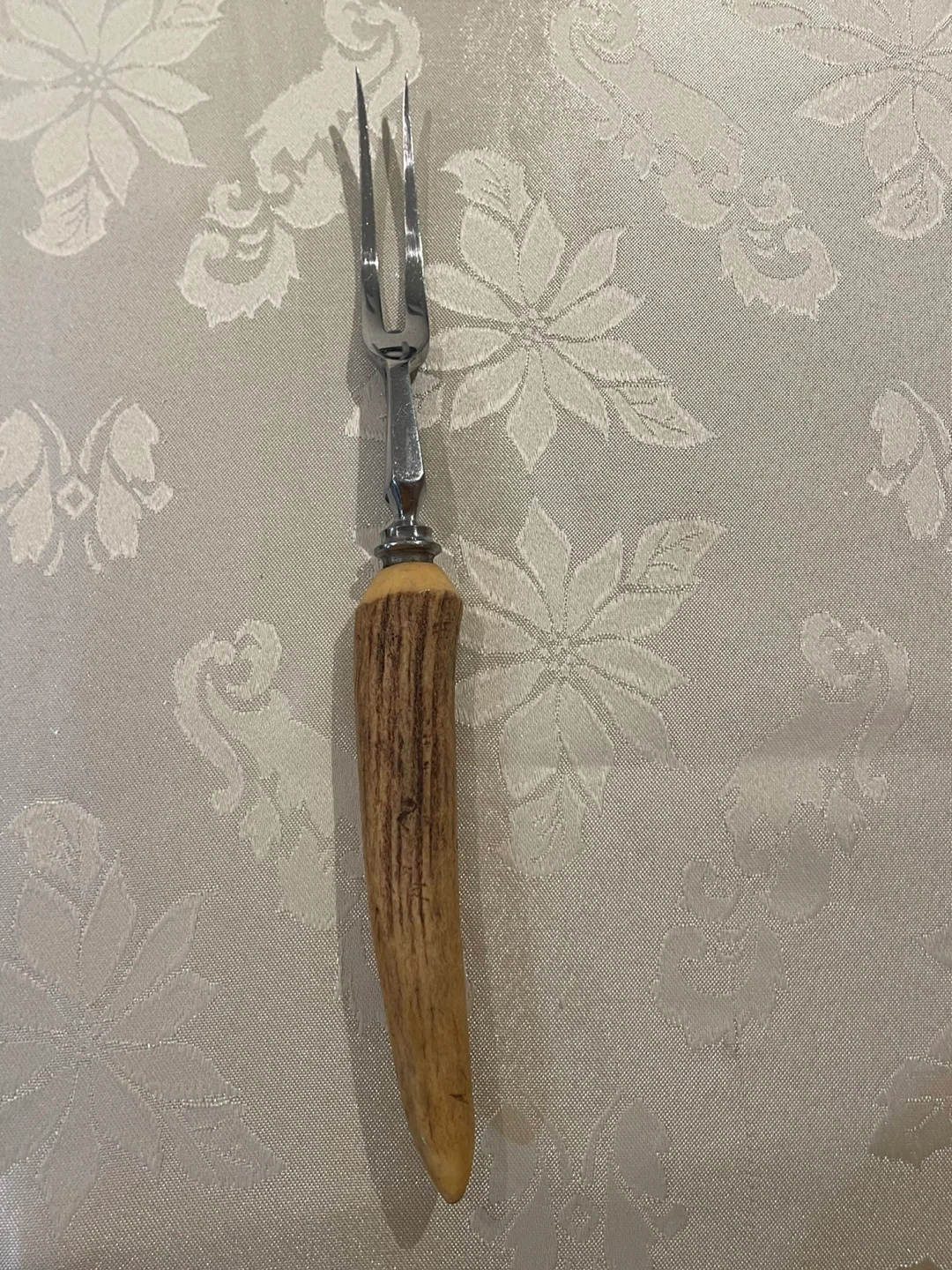 Selling a vintage meat carving fork, marked "Made in England (Stainless)". It has a unique antler-style handle and is in great condition for its age! Perfect for carving up your next roast dinner