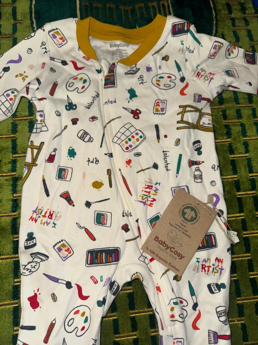 This BabyCosy onesie is made from 100% organic cotton and features a cute all-over print with art supplies like paint palettes, brushes, and pencils