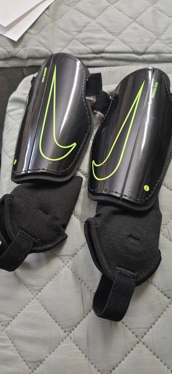 Selling a pair of Nike Charge shin guards in size large. They are black with the Nike swoosh in a bright neon green. They're in good condition and ready for a new player!