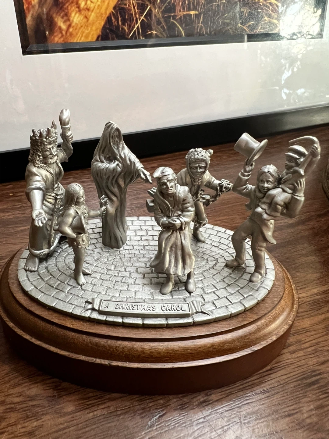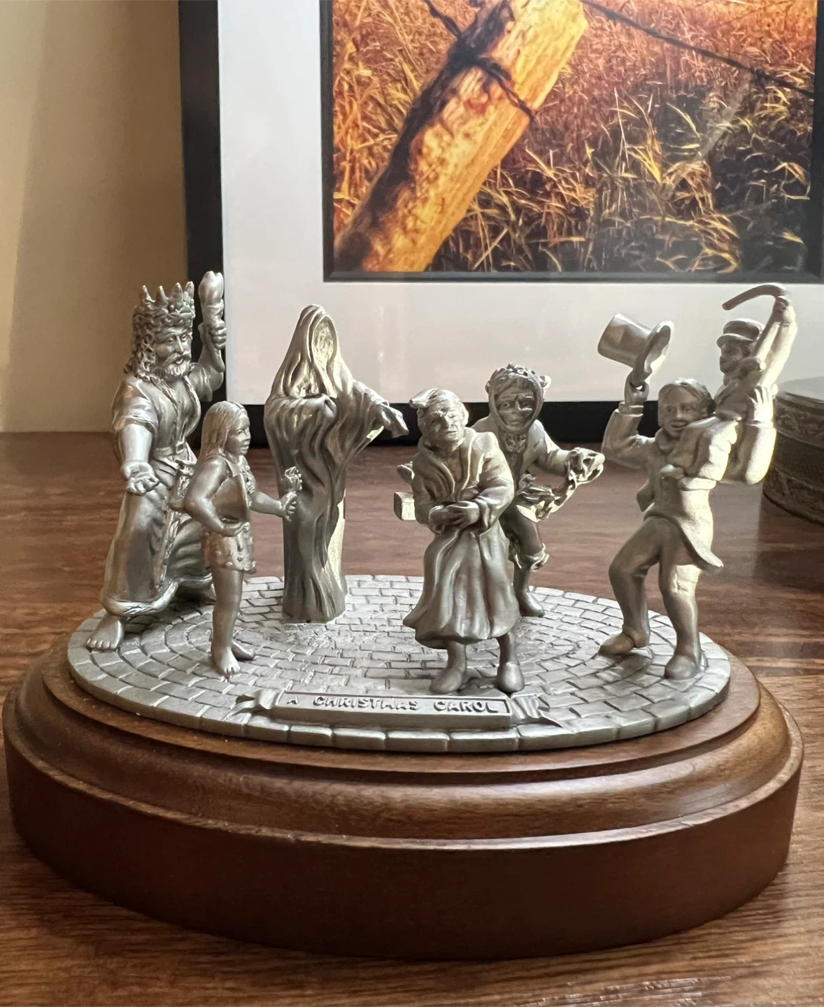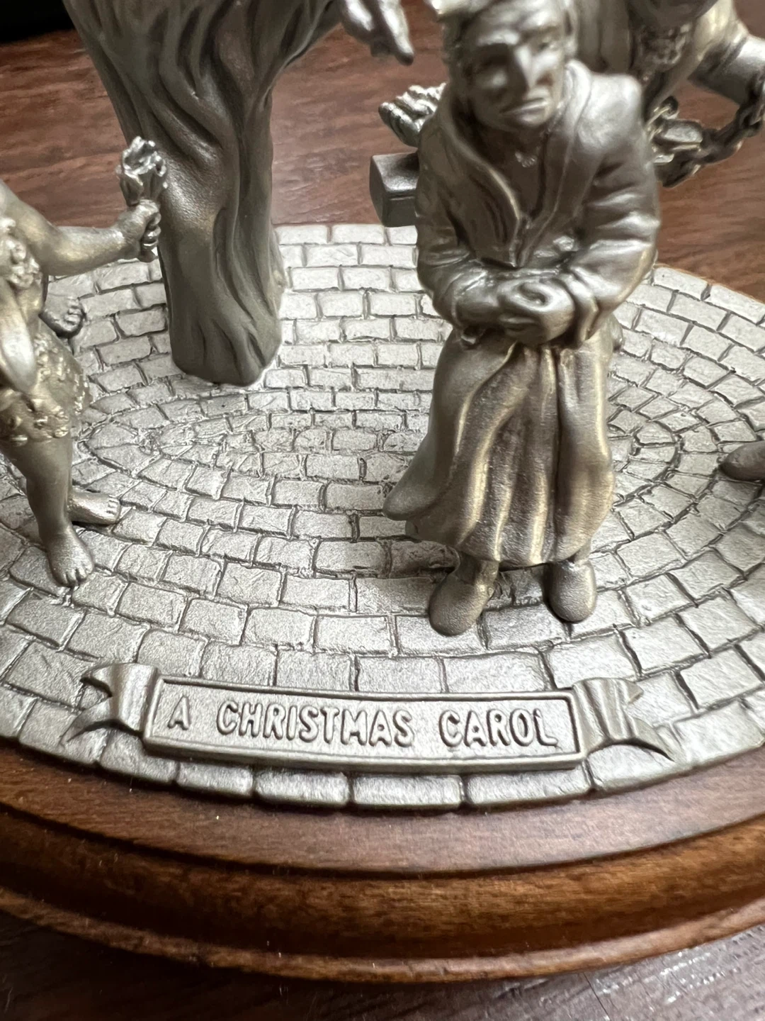 Made out of pewter and mounted on a wooden base with the title "A Christmas Carol" on a small plaque