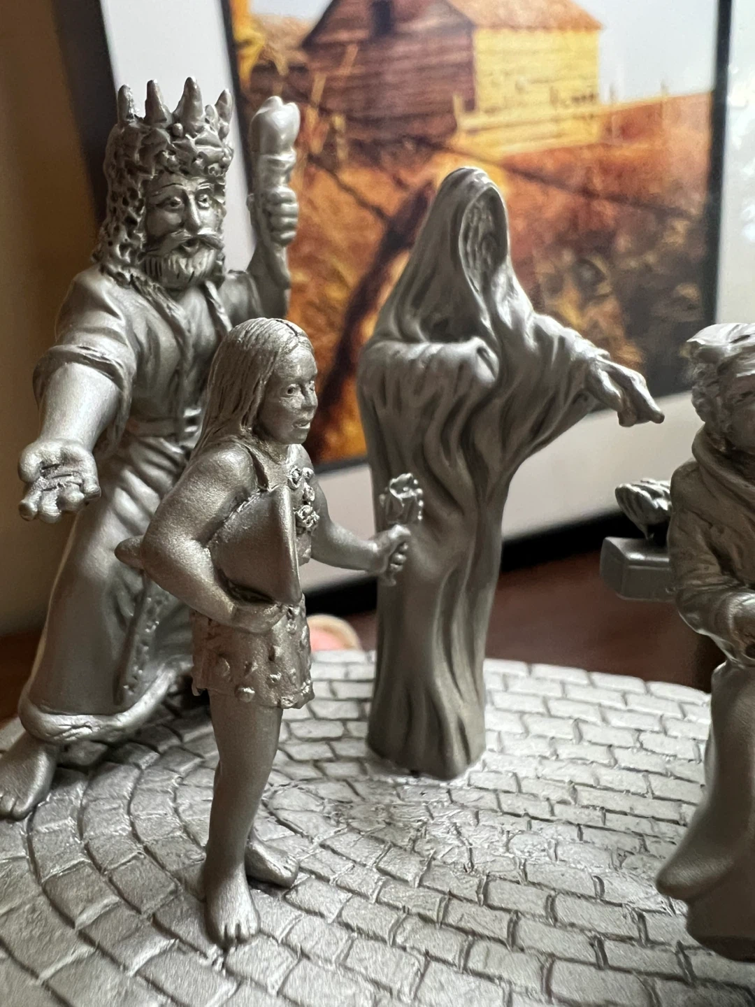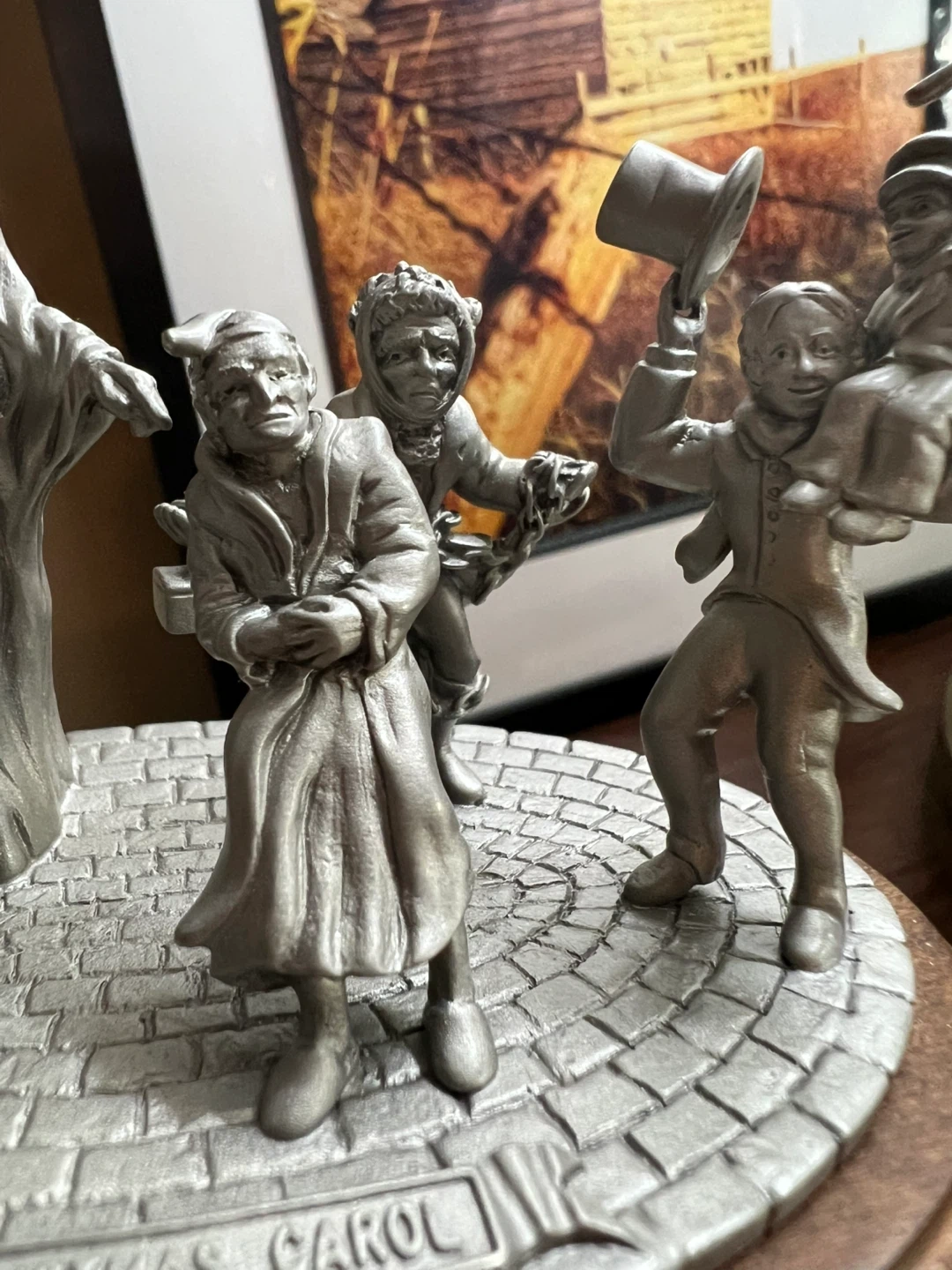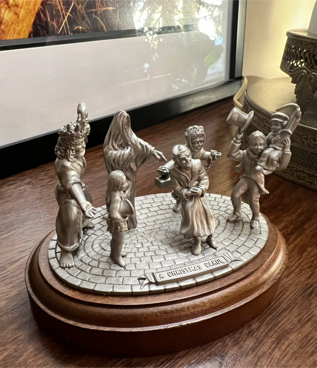 Made out of pewter and mounted on a wooden base with the title "A Christmas Carol" on a small plaque