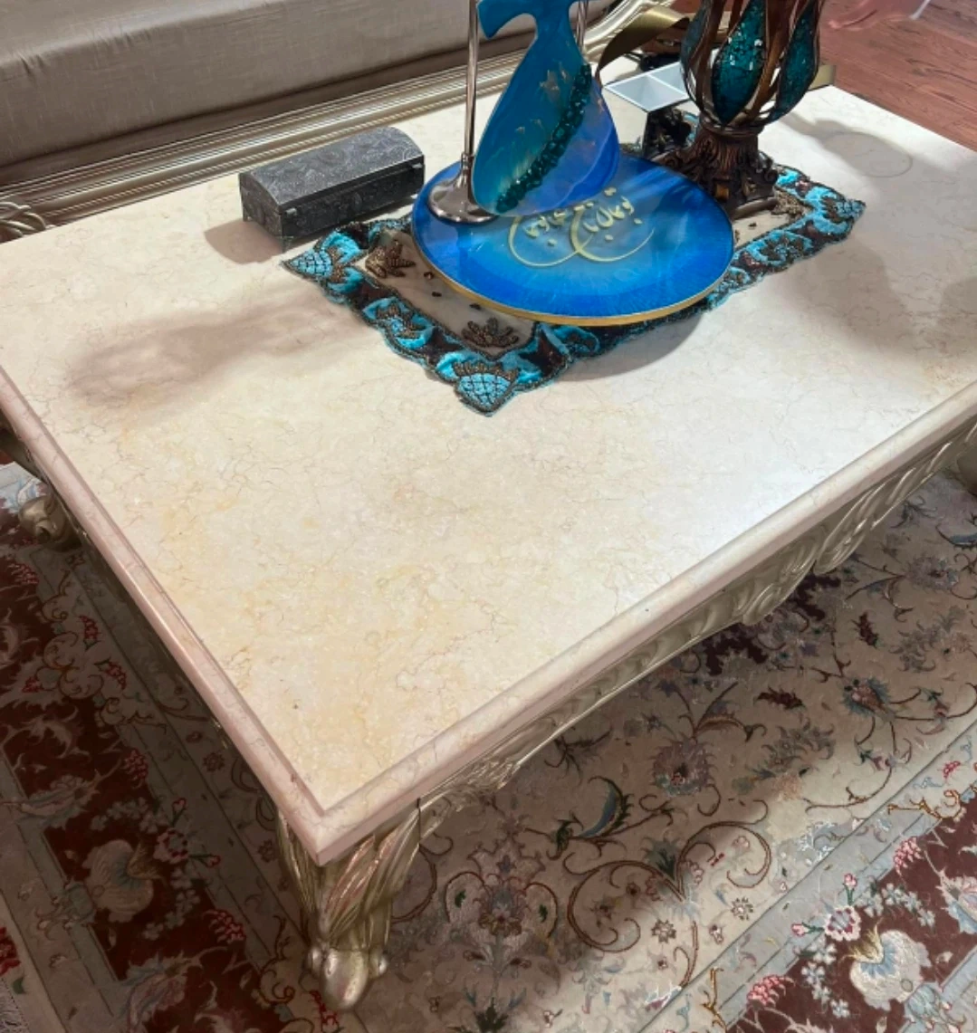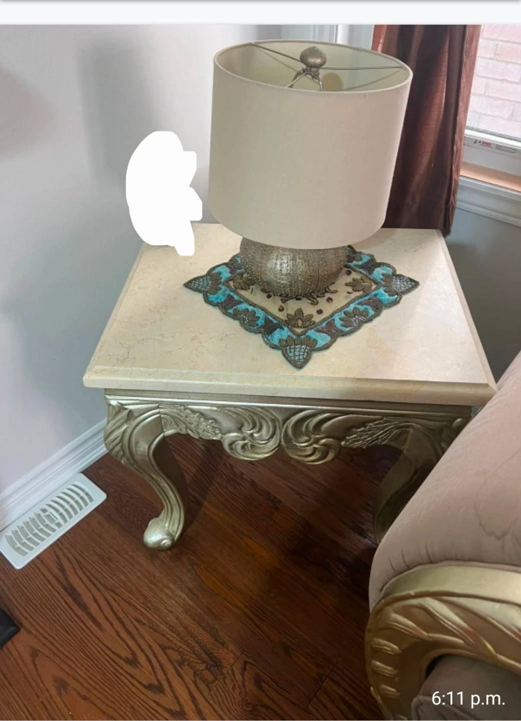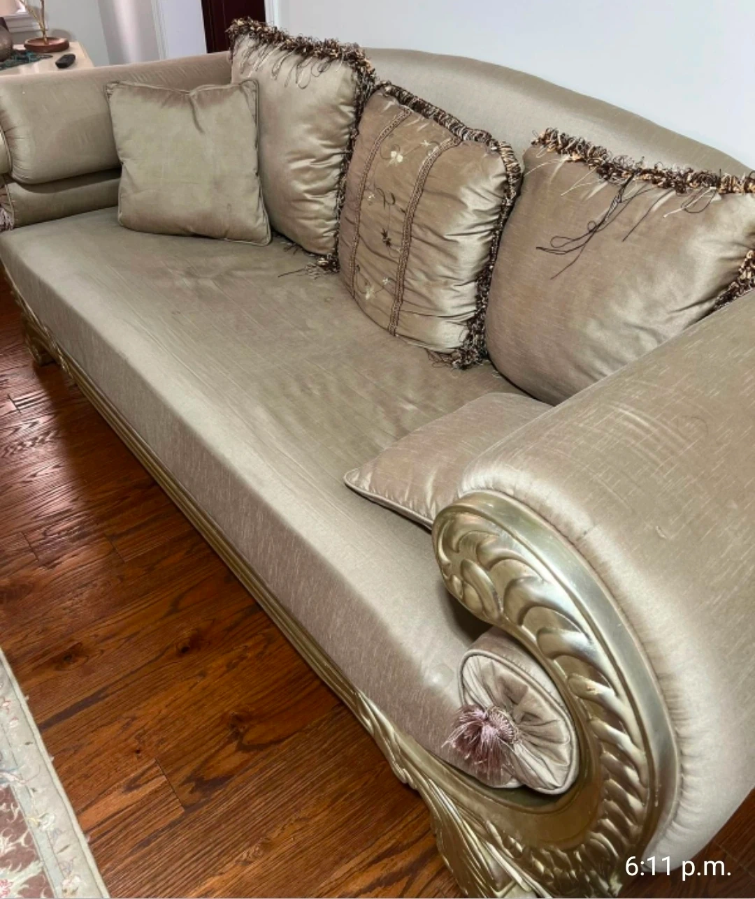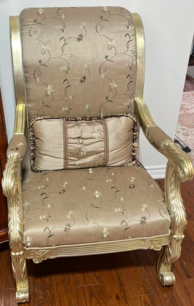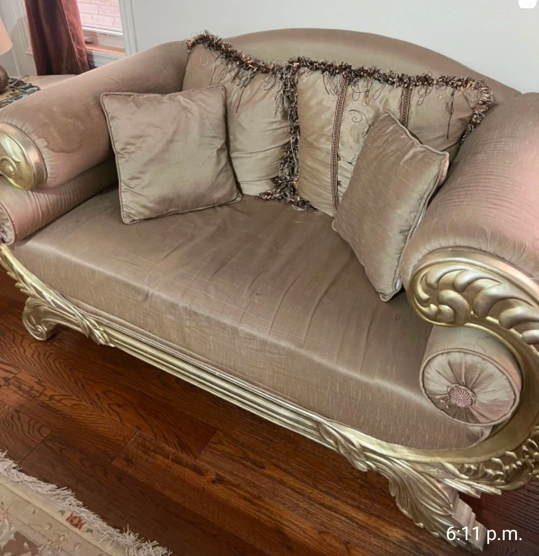 Selling a beautiful set of ornate furniture, including a sofa, armchair, and side tables. The pieces feature a classic design with gold detailing and neutral upholstery. They would be a great addition to any living room or sitting area!