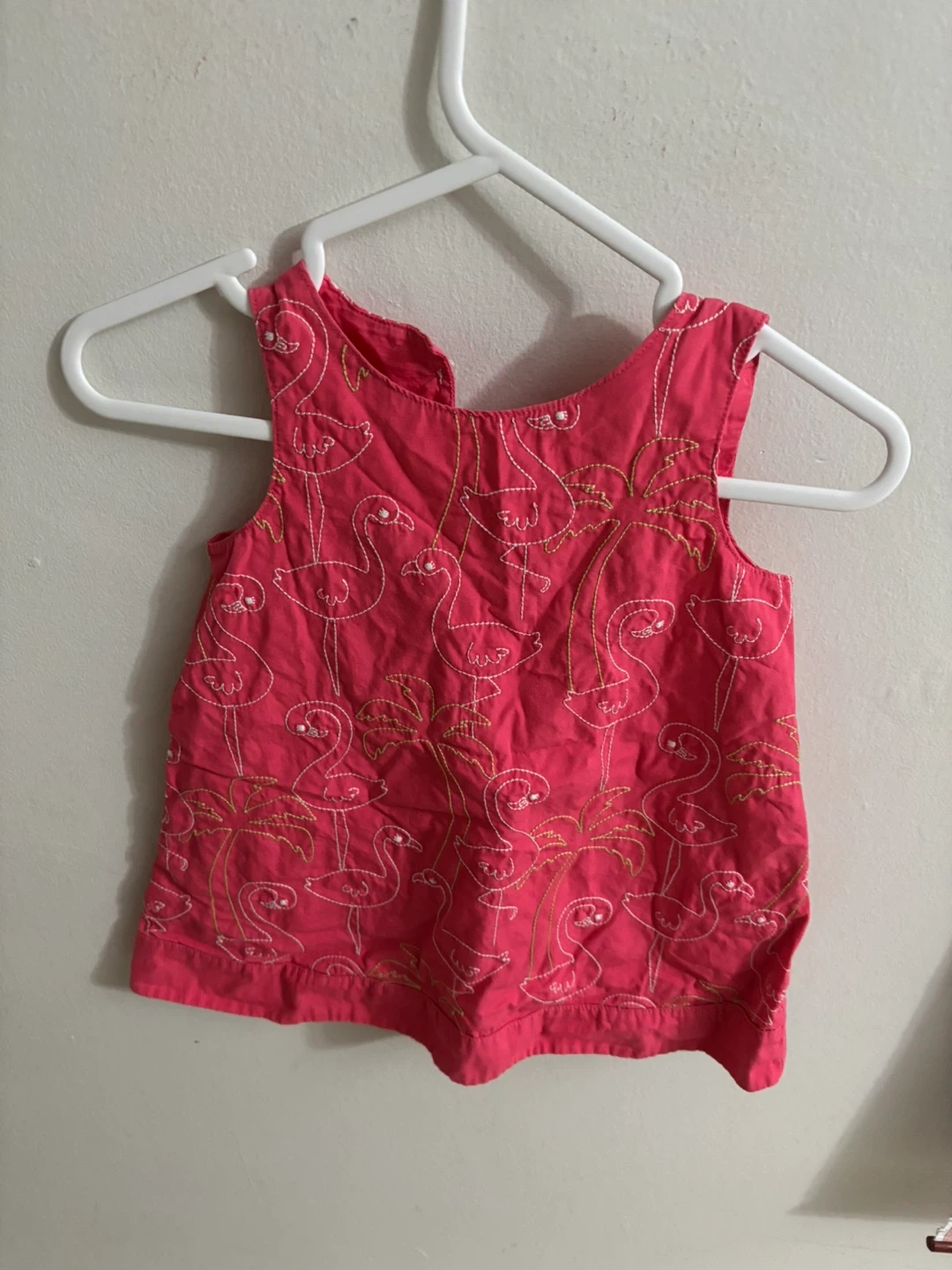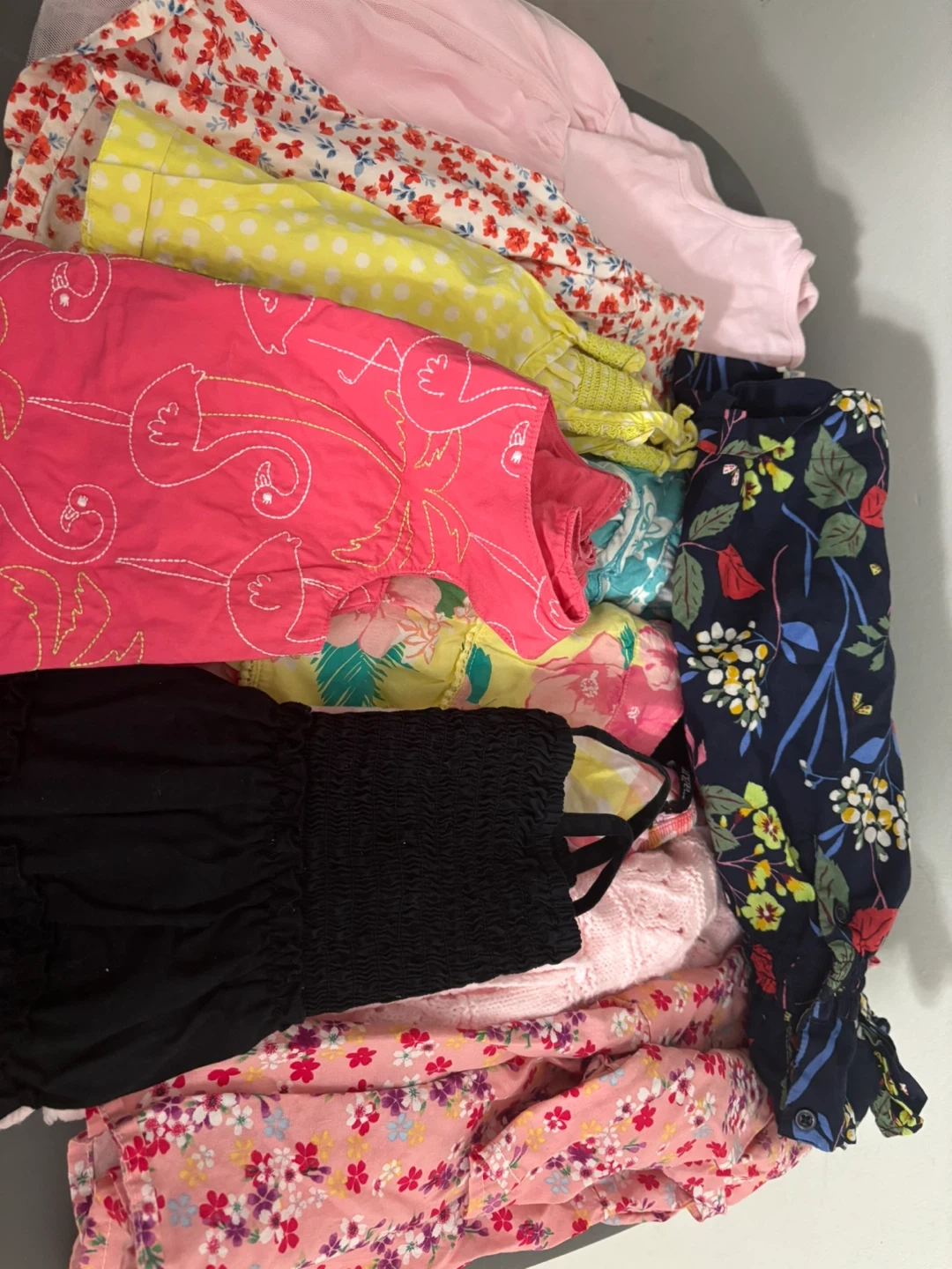 A bundle of girls dresses in various colors and patterns. There are floral prints, flamingo designs, and solid colors. Perfect for a little girl's wardrobe!