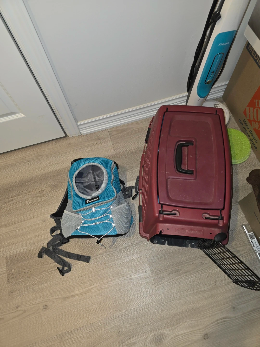 Selling a bottle of Pro-Otic ear cleaner for pets, veterinary use only. Also available is a blue Pawaboo pet carrier backpack. Great for taking your furry friend on adventures