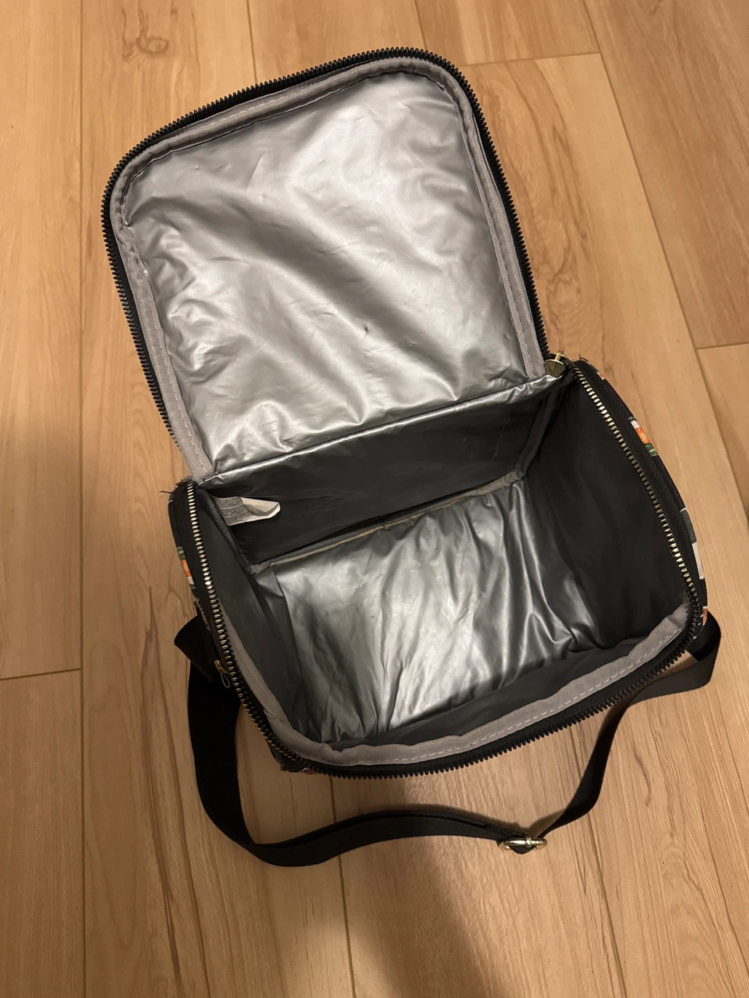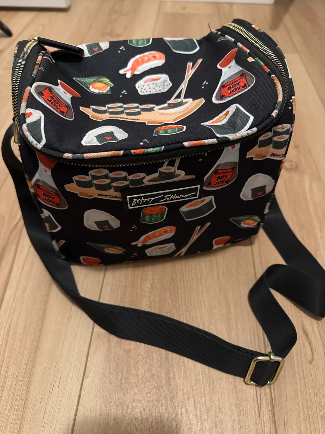Super cute Betsey Johnson lunch bag with a fun sushi print! It's perfect for carrying your lunch in style. The bag is insulated to keep your food fresh, and it has a convenient shoulder strap for easy carrying.