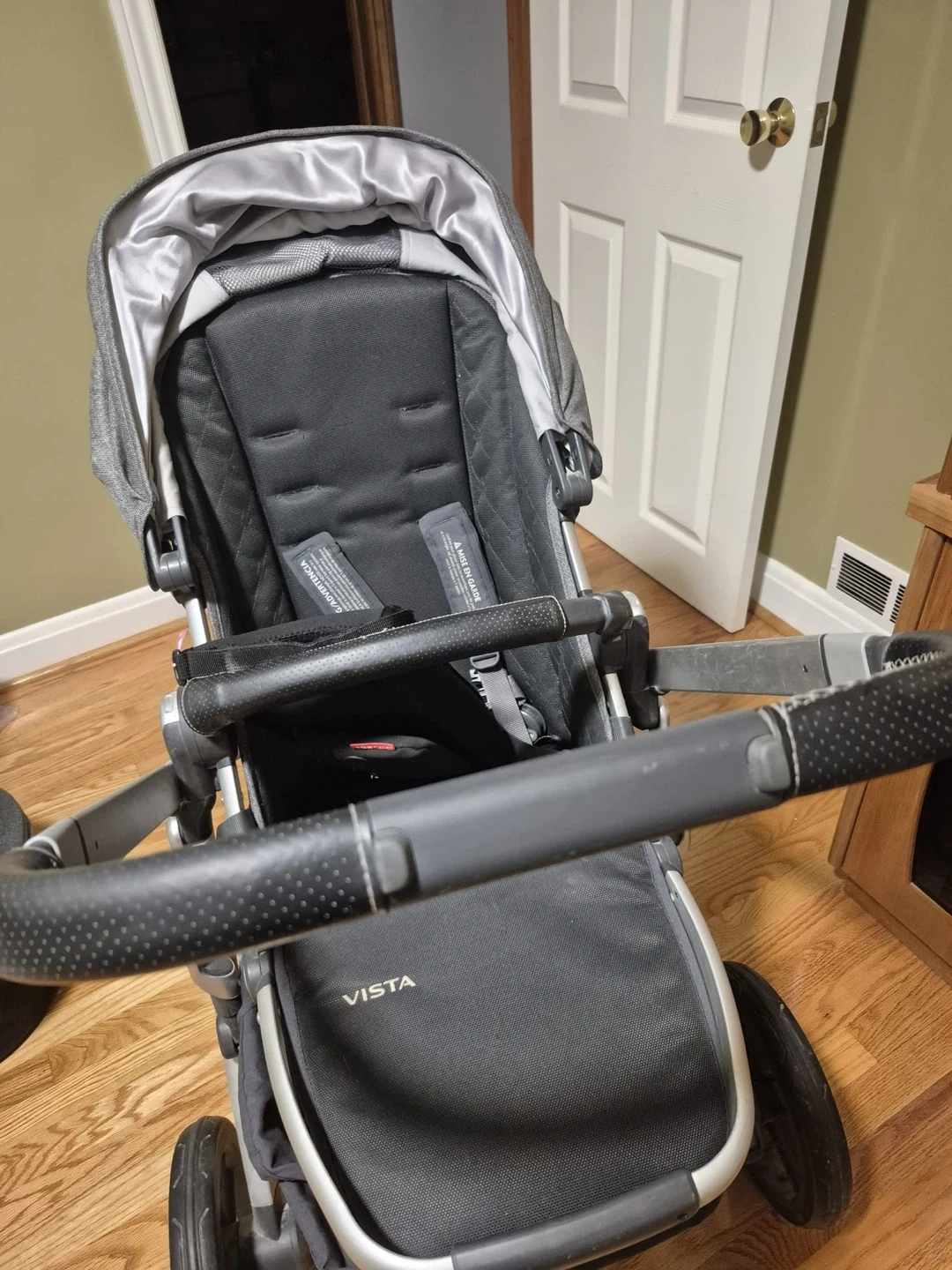 Selling an UPPAbaby VISTA stroller in great condition! It comes with the bassinet attachment, perfect for newborns. The stroller is grey and made of 100% polyester. Manufactured in Feb 2019.