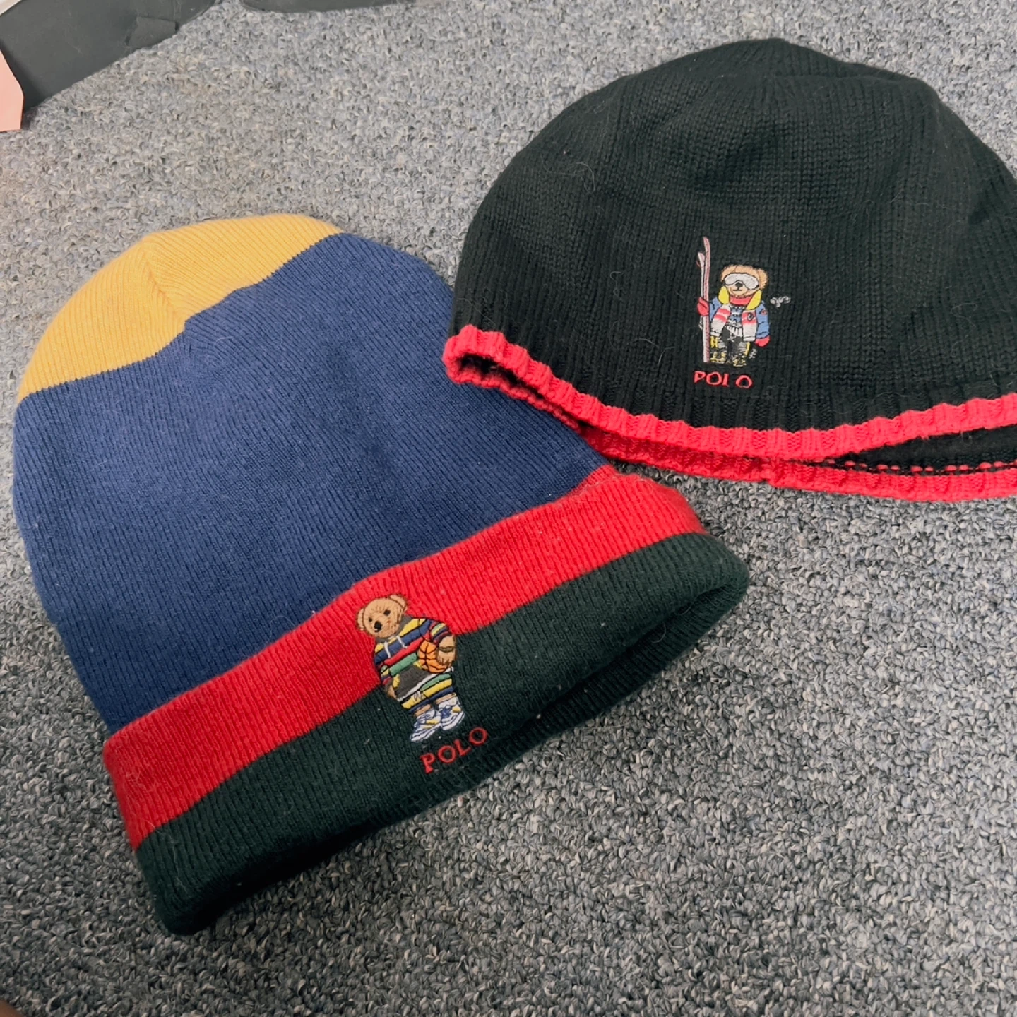 Selling two Polo Ralph Lauren beanie hats. One is black with a skiing bear and red trim, and the other is blue, yellow, red, and green with a basketball bear. Both are in great condition!