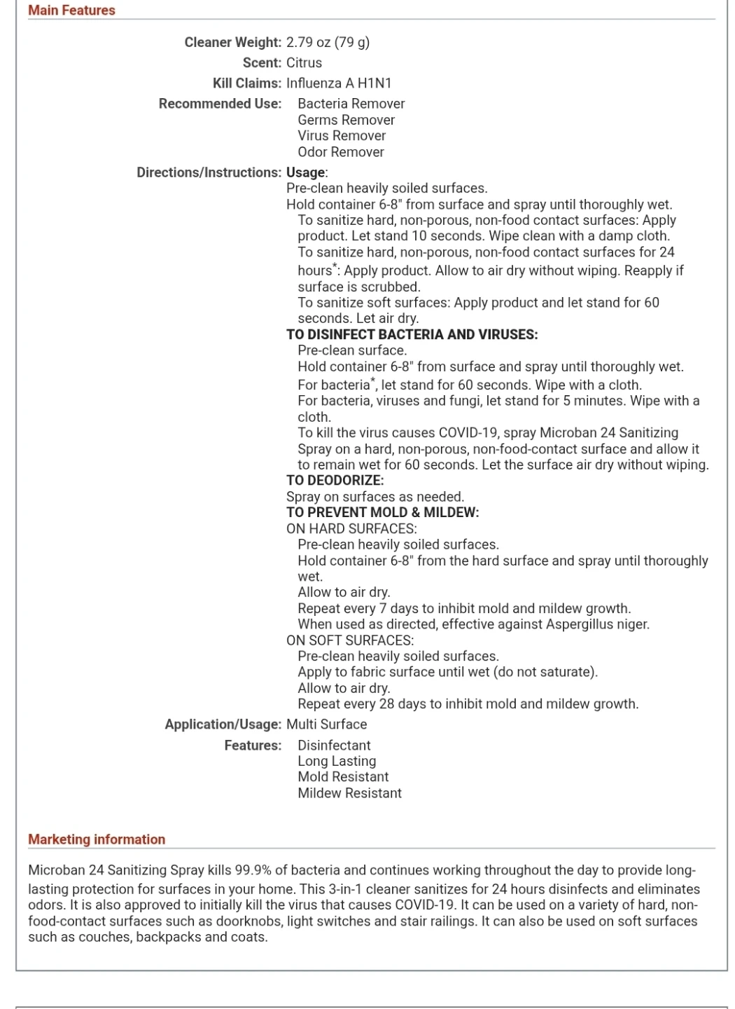 Brand New Microban Professional Sanitizing Spray, Citrus Scent