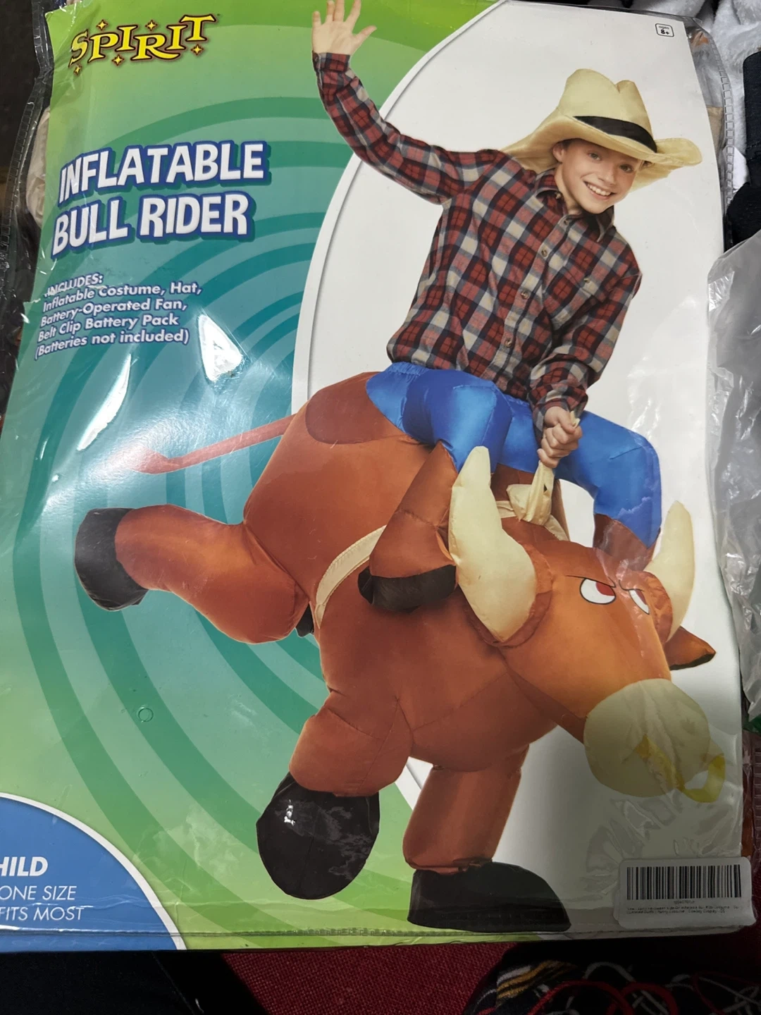 Selling a Spirit Inflatable Bull Rider costume for kids! It includes the inflatable costume, hat, battery-operated fan, and belt clip battery pack. Batteries are not included. One size fits most children.