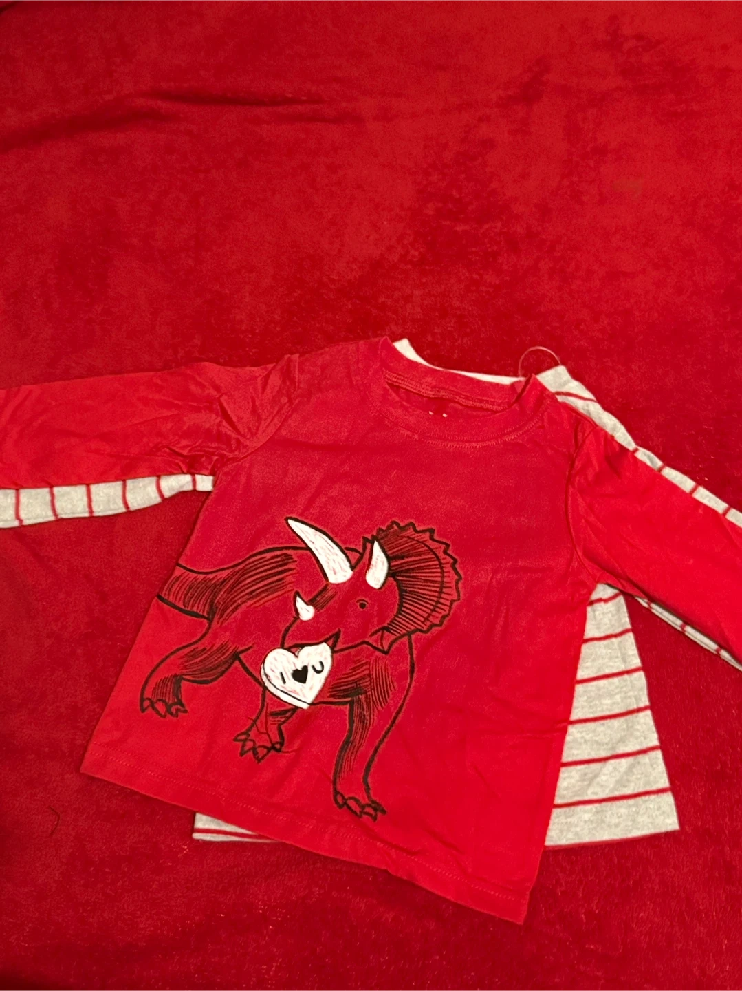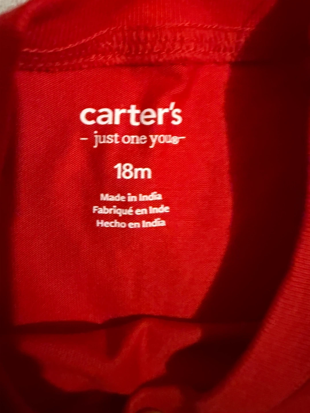 I'm selling a cute red long-sleeved shirt from Carter's Just One You line! It features a fun dinosaur design and is sized for 18-month-olds. Perfect for your little one!