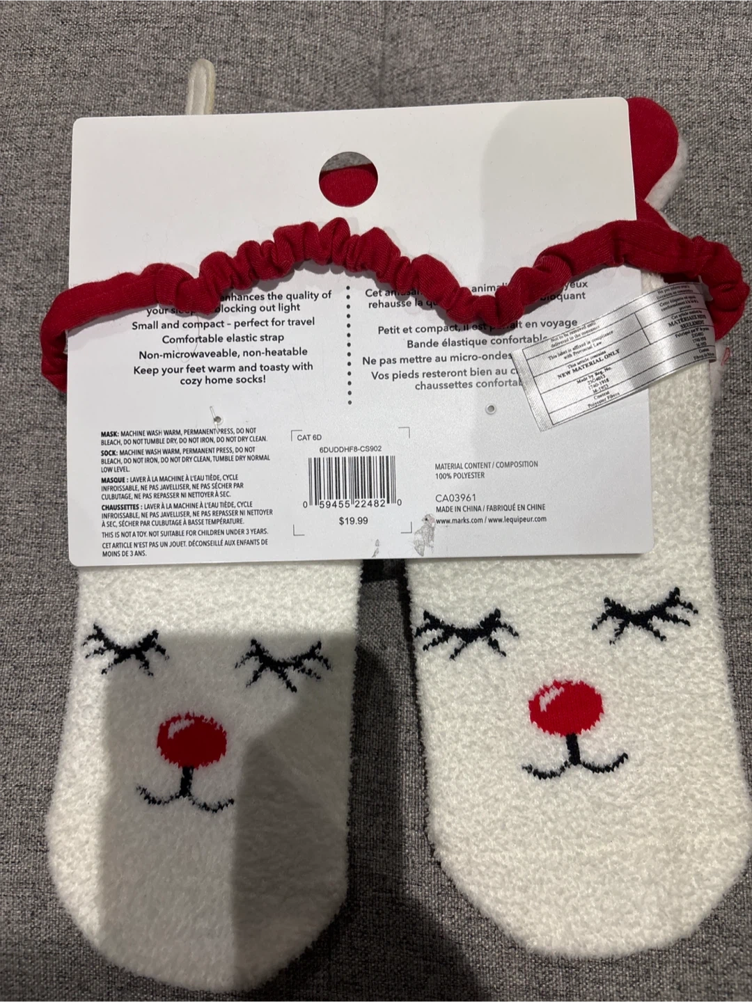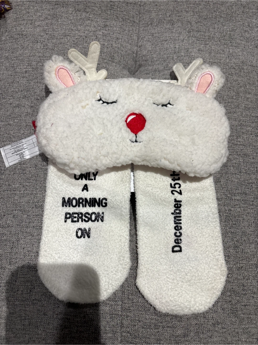 Super cute and cozy reindeer-themed socks and sleep mask set! The socks are white with a sweet reindeer face design, and the sleep mask matches perfectly. The packaging indicates they were originally $19.99. Perfect for keeping your feet warm and toasty!