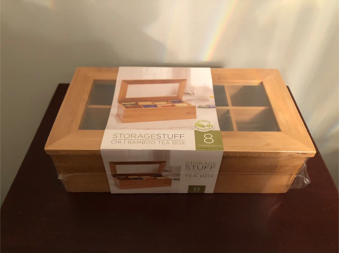 Selling a brand new StorageStuff Chi Bamboo Tea Box! It's perfect for storing and displaying your tea. The box features a lightweight and durable bamboo construction with a large viewing window so you can see all your delicious flavours of tea. It also has 8 storage compartments to help you organize your tea and see at a glance when it's time to restock your favourite tea bags. Dimensions are 31 cm x 16.5 cm x 9.5 cm tall (12.25" x 6.5" x 3.75")