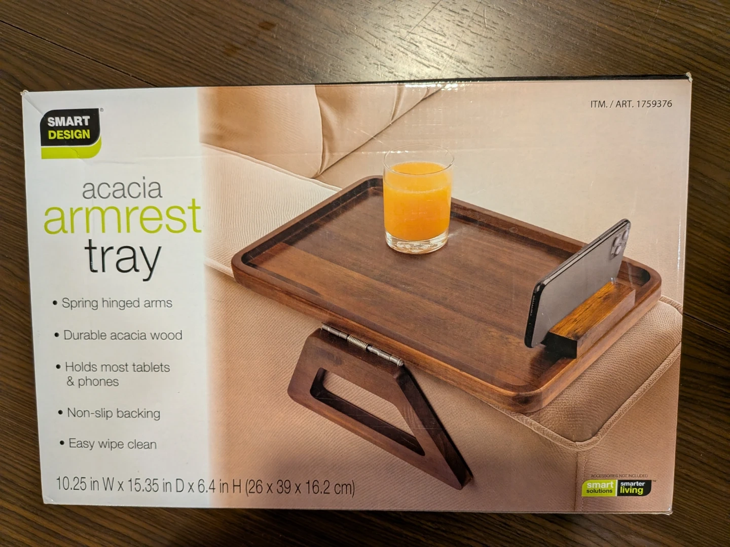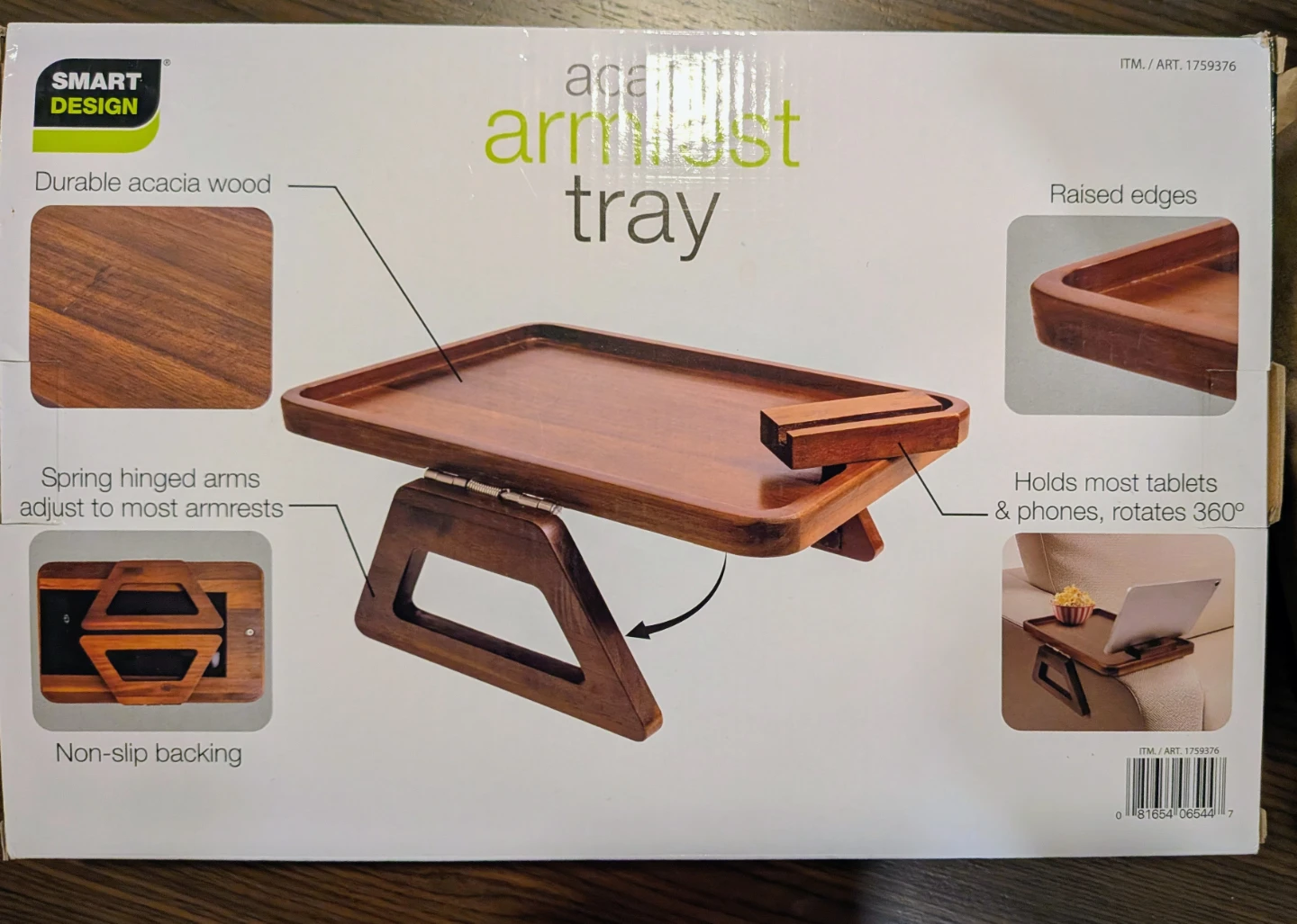 Selling a Smart Design acacia armrest tray! It's made of durable acacia wood and features spring-hinged arms that adjust to most armrests. It's designed to hold most tablets and phones, and it has a non-slip backing. It's easy to wipe clean, too! Dimensions are 10.25 in W x 15.35 in D x 6.4 in H (26 x 39 x 16.2 cm)