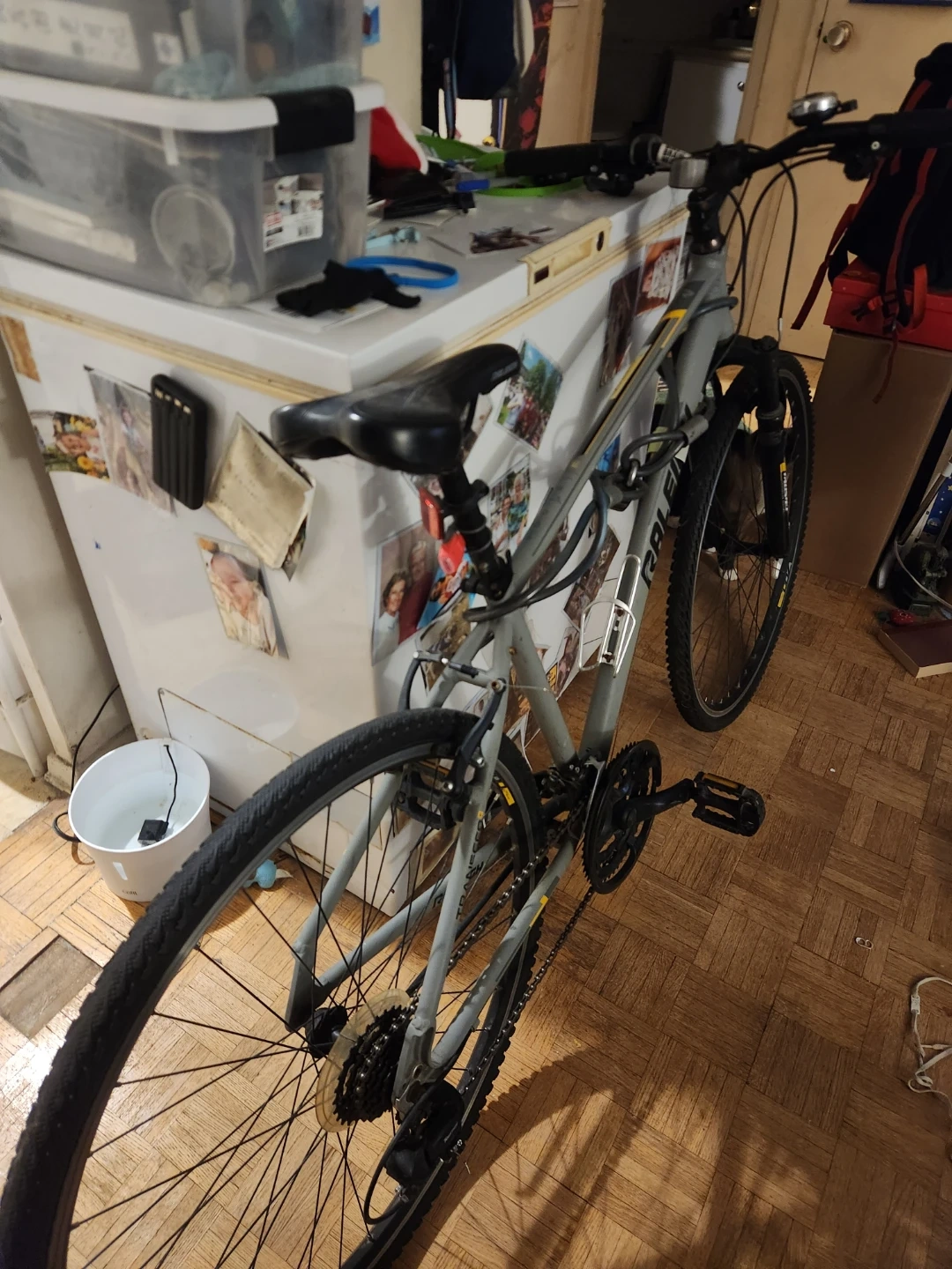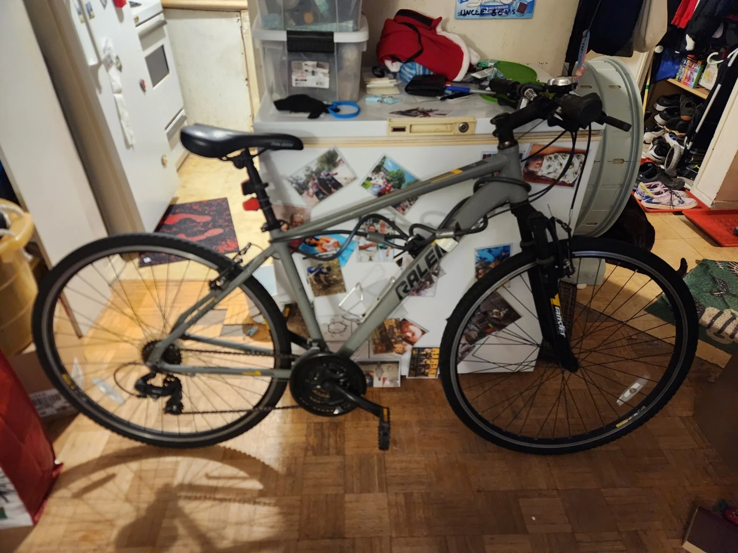 Selling a Raleigh bike in good condition. It's ready for some new adventures! Heavy duty lock included. Bell included. Good bike used maybe a dozen times. Both wheels just replaced recently.