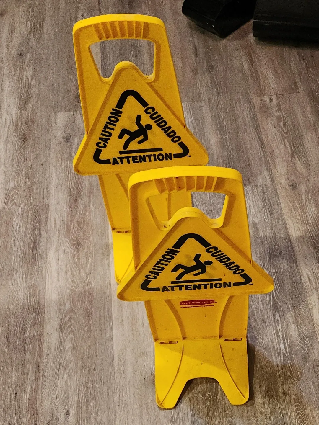 Selling a Rubbermaid caution sign that indicates wet floors. It's bright yellow and has the standard caution symbol. Great for home or business use!