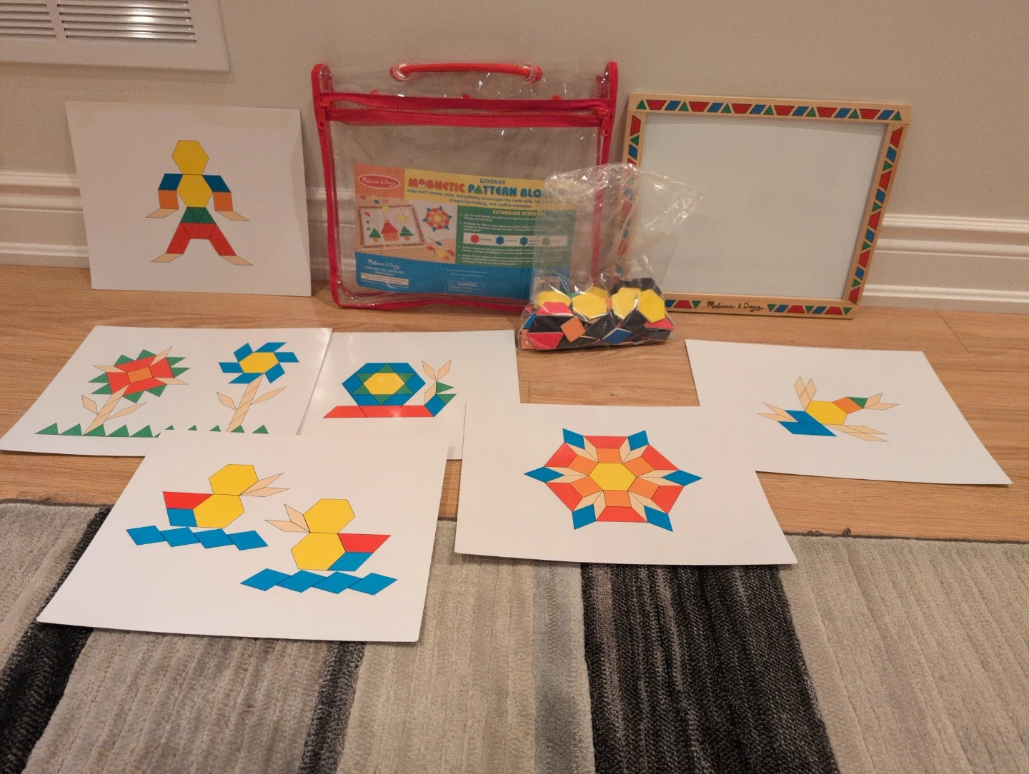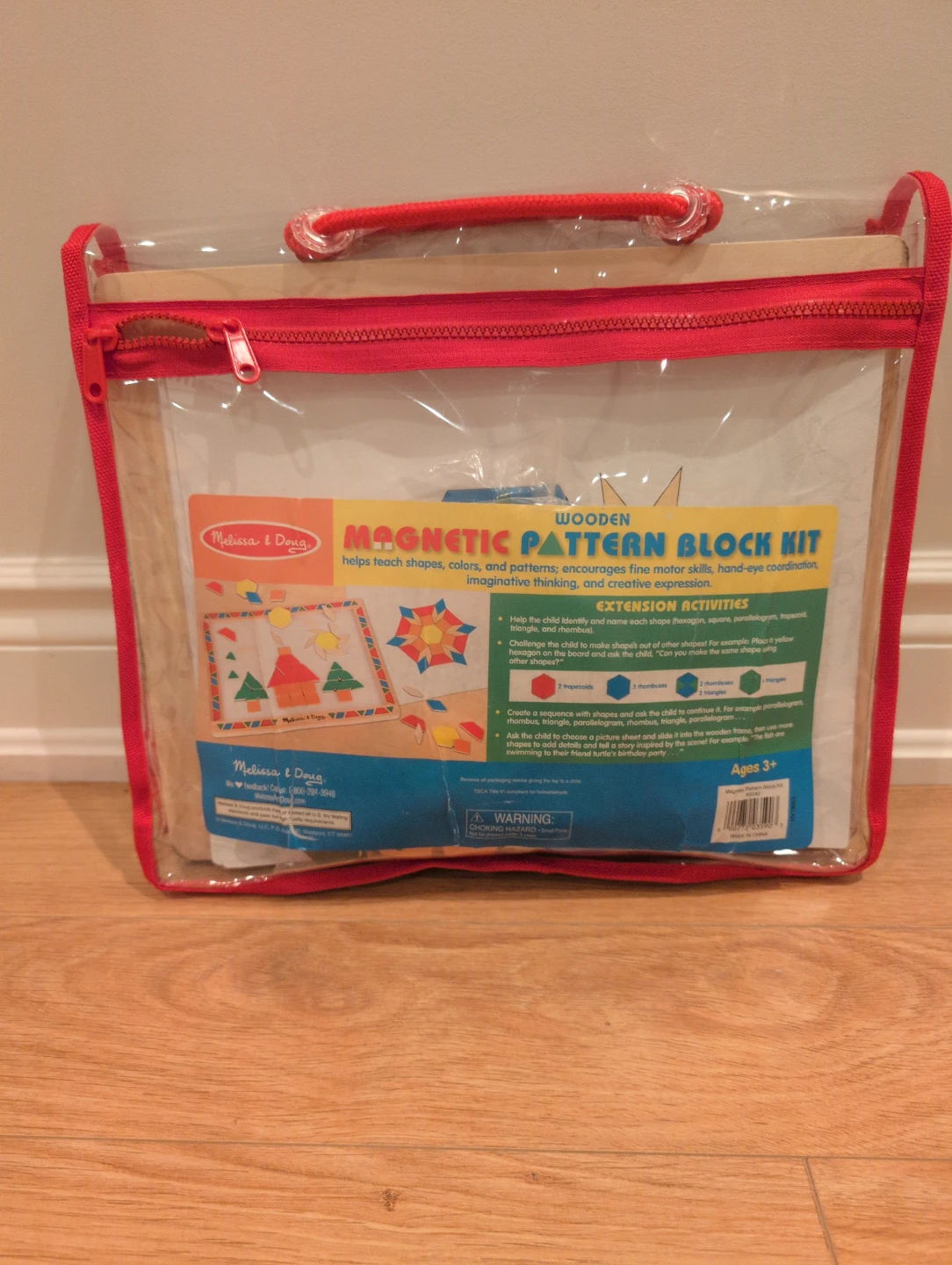 Selling a Melissa & Doug Magnetic Pattern Block Kit! This kit helps teach shapes, colours, and patterns. It encourages fine motor skills, hand-eye coordination, imaginative thinking, and creative expression. Recommended for ages 3+