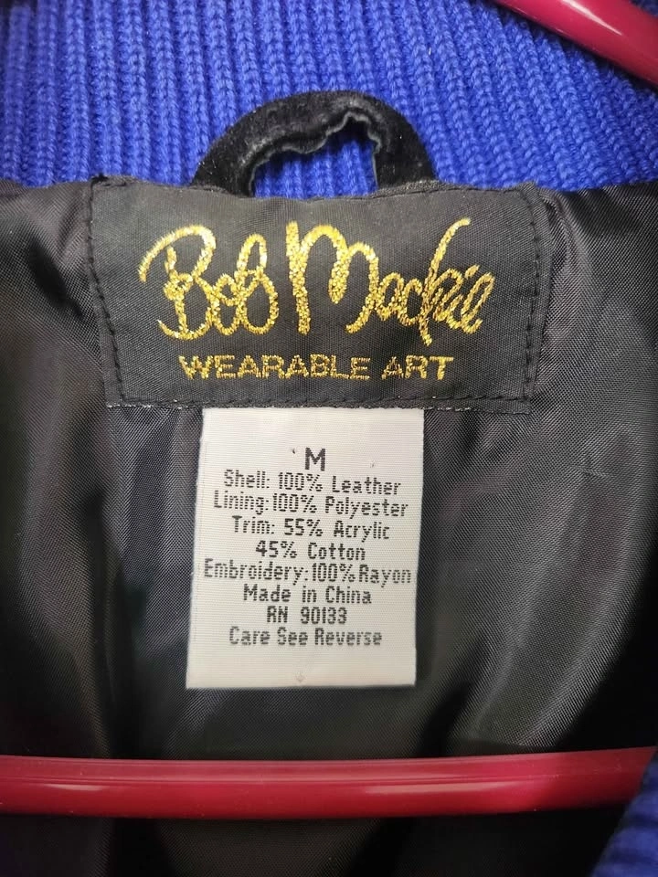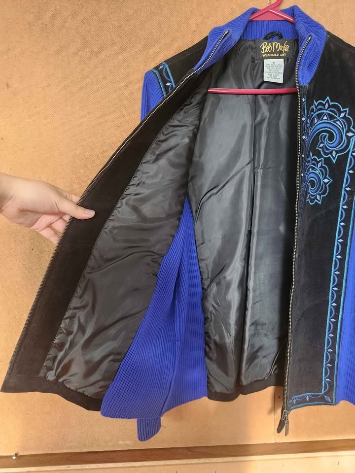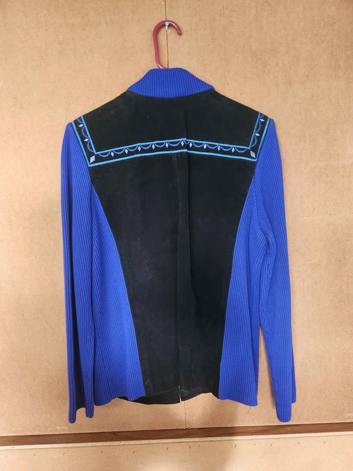 • Solid leather torso (black) and flexible knit sleeves and collar (blue)
