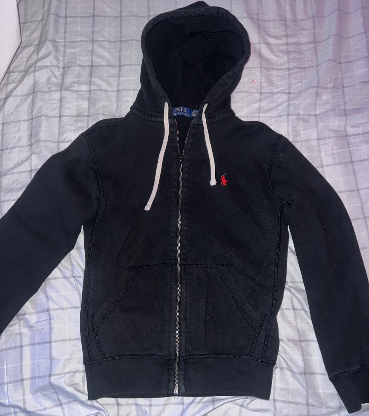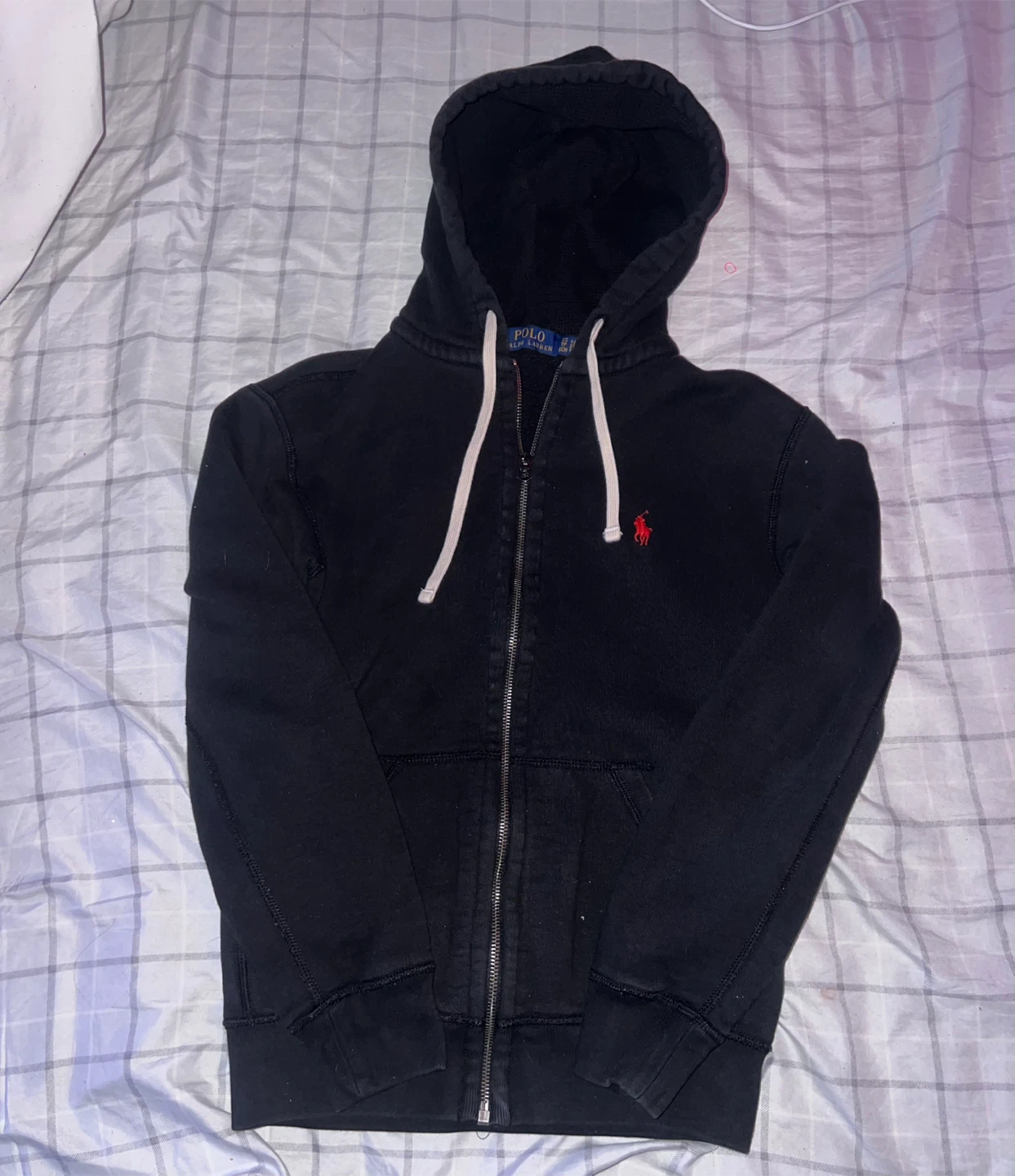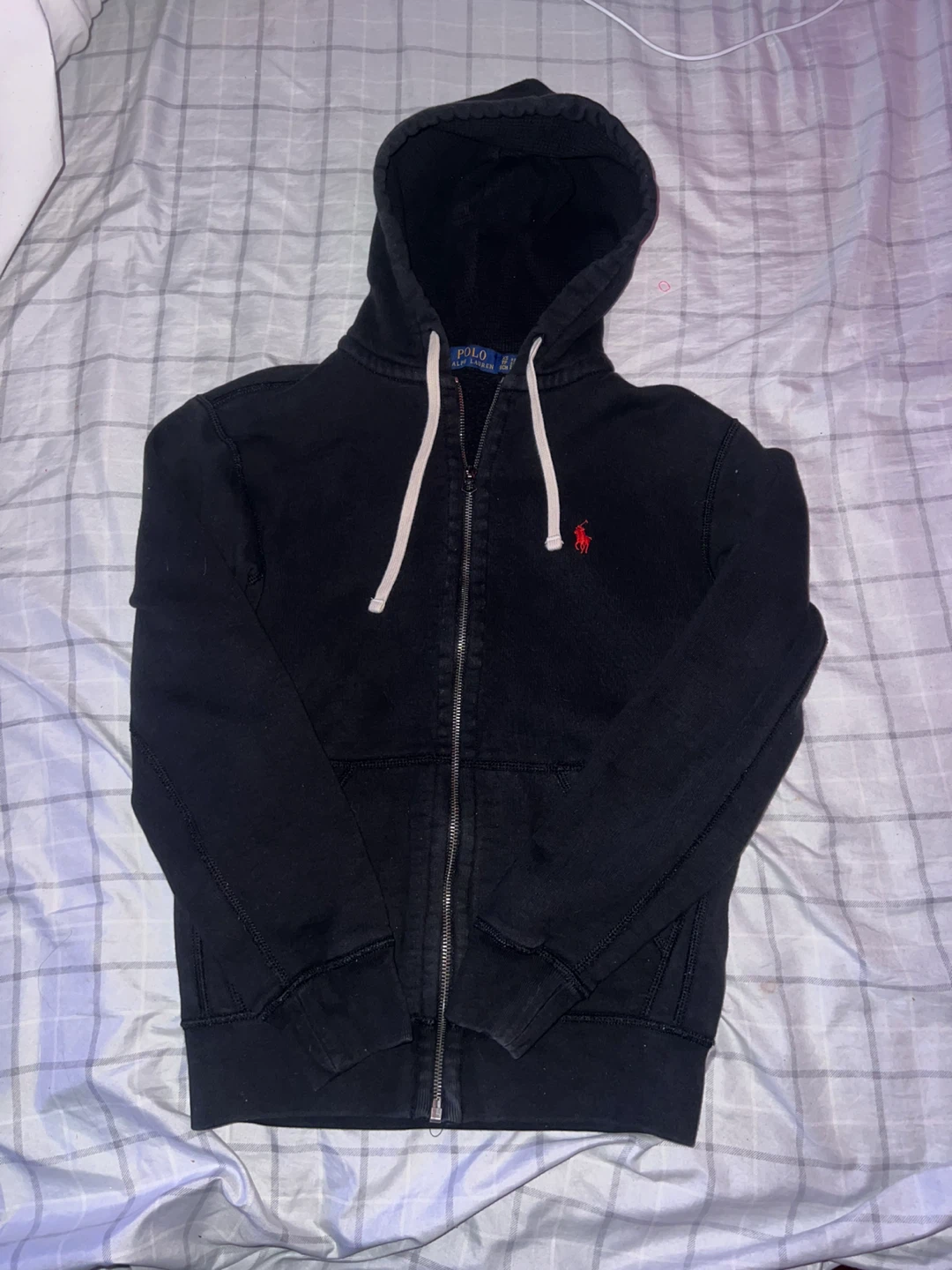 Selling a Polo Ralph Lauren black zip-up hoodie. It's in good condition and features the iconic Polo logo. Perfect for layering or wearing on its own!