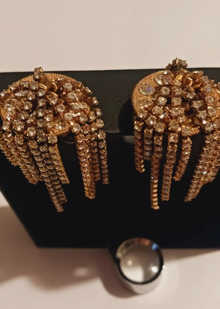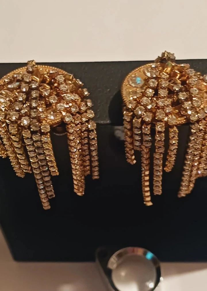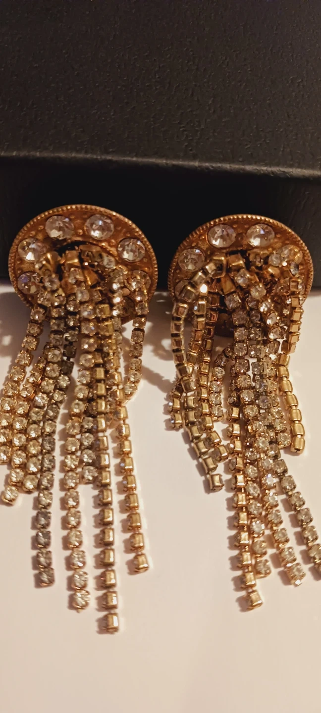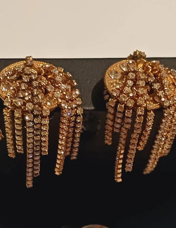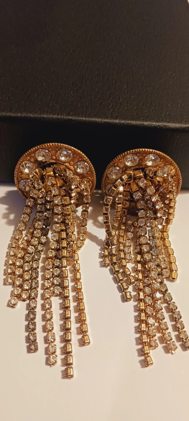 MIRIAM HASKELL DESIGNER SIGNED RARE 1940s COLLECTIBLE GRANDIOSE GOLD TONE FILIGREE SPARKLING RHINESTONES DANGLING CLIP-ON EARRINGS. THEY ARE IN EXCELLENT CONDITION AND READY TO ADD SOME SPARKLE TO YOUR LOOK !! 3"×1". ALL MY PRICES ARE NEGOTIABLE !!! ( These are $850-- $1,200 on ebay), very rare Collectible item). ALL MY PRICES ARE NEGOTIABLE !!! THIS IS AN AUTHENTIC SIGNED RARE COLLECTIBLE ITEM !!!