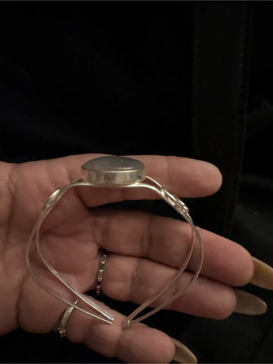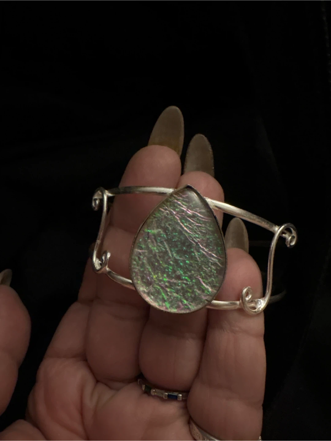 925 Sterling Silver cuff bracelet featuring a tear-drop shaped stone with iridescent colors. The bracelet has an open back and a unique, artistic design. Great to add a touch of elegance to any outfit! New