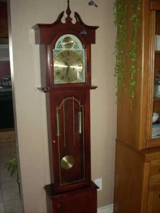 Selling a Galleria grandfather clock. It has a beautiful design and would look great in any home! It does have some wear and tear, as shown in the photos. It is still working.