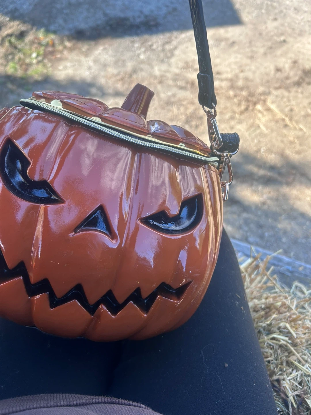 This is a super cute pumpkin purse, perfect for Halloween! It's in great condition and ready for a new owner. It has a zipper closure and a shoulder strap