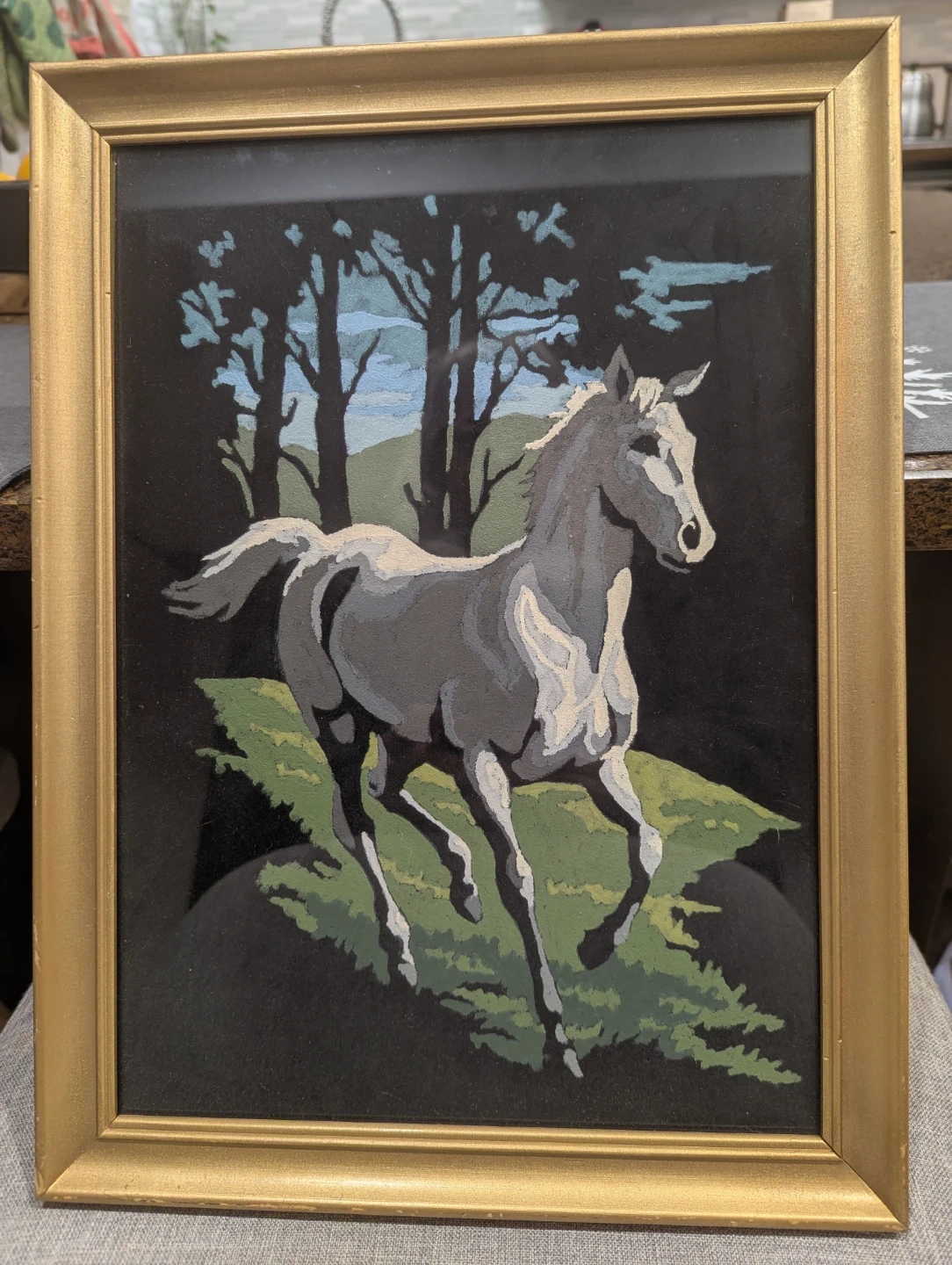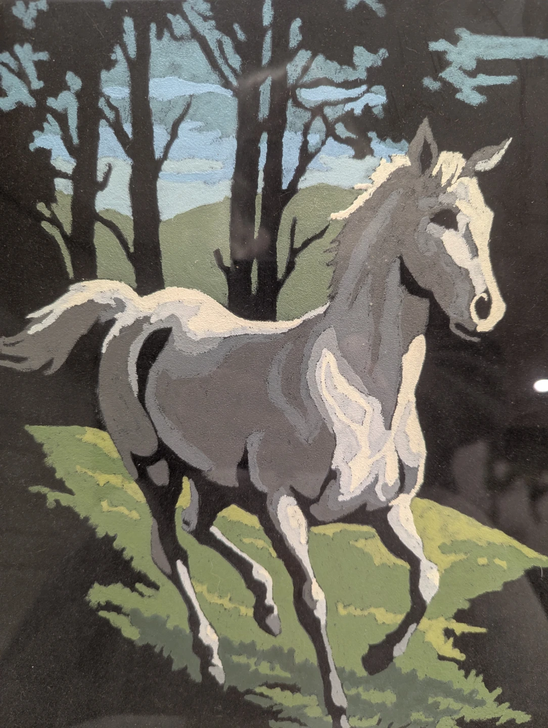 Framed Vintage Horse Painting. CraftMaster "Gray Steed" Paint-by-Number acrylic on black velvet. 1960's-1970's kit.