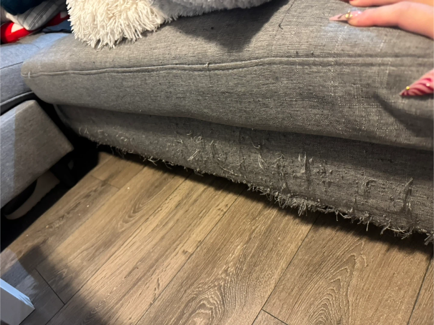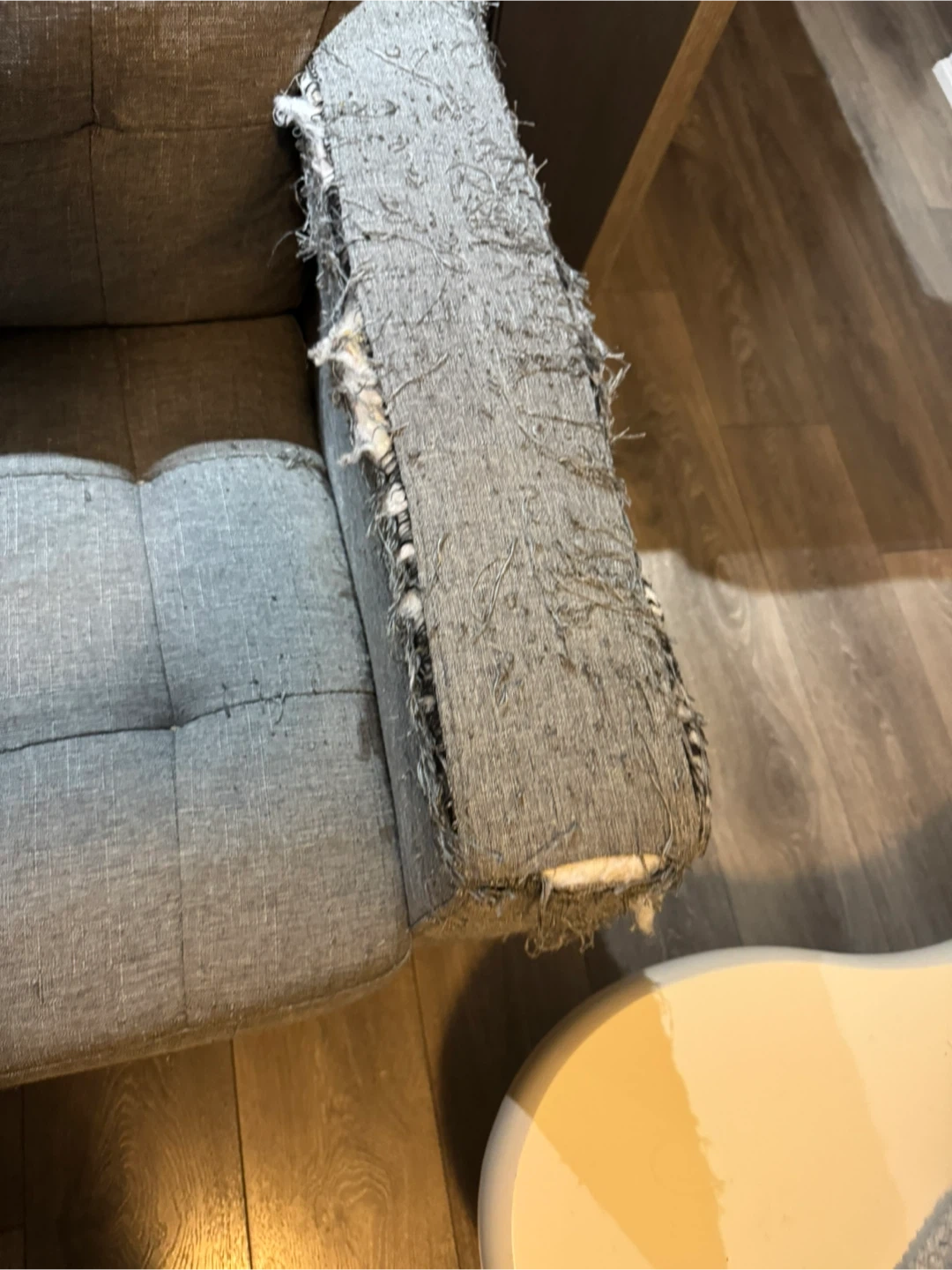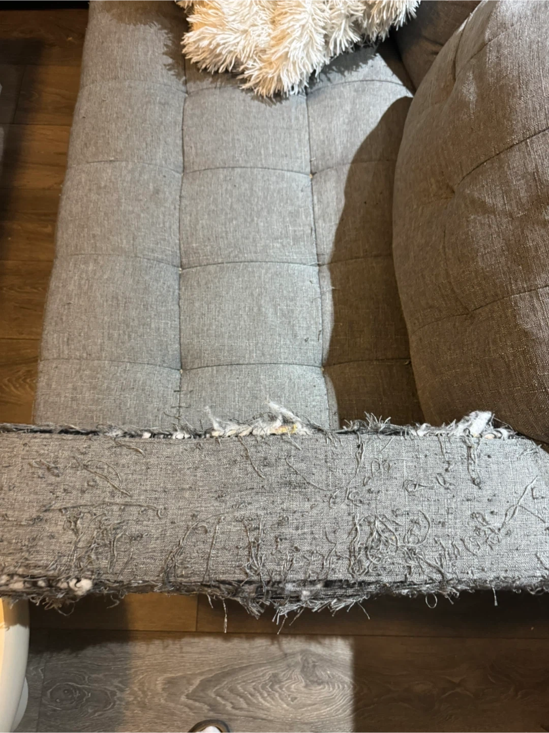 Selling a grey sofa for free, significant wear and tear from my cat. Pictures of tearing from claws can be seen in the photos provided.