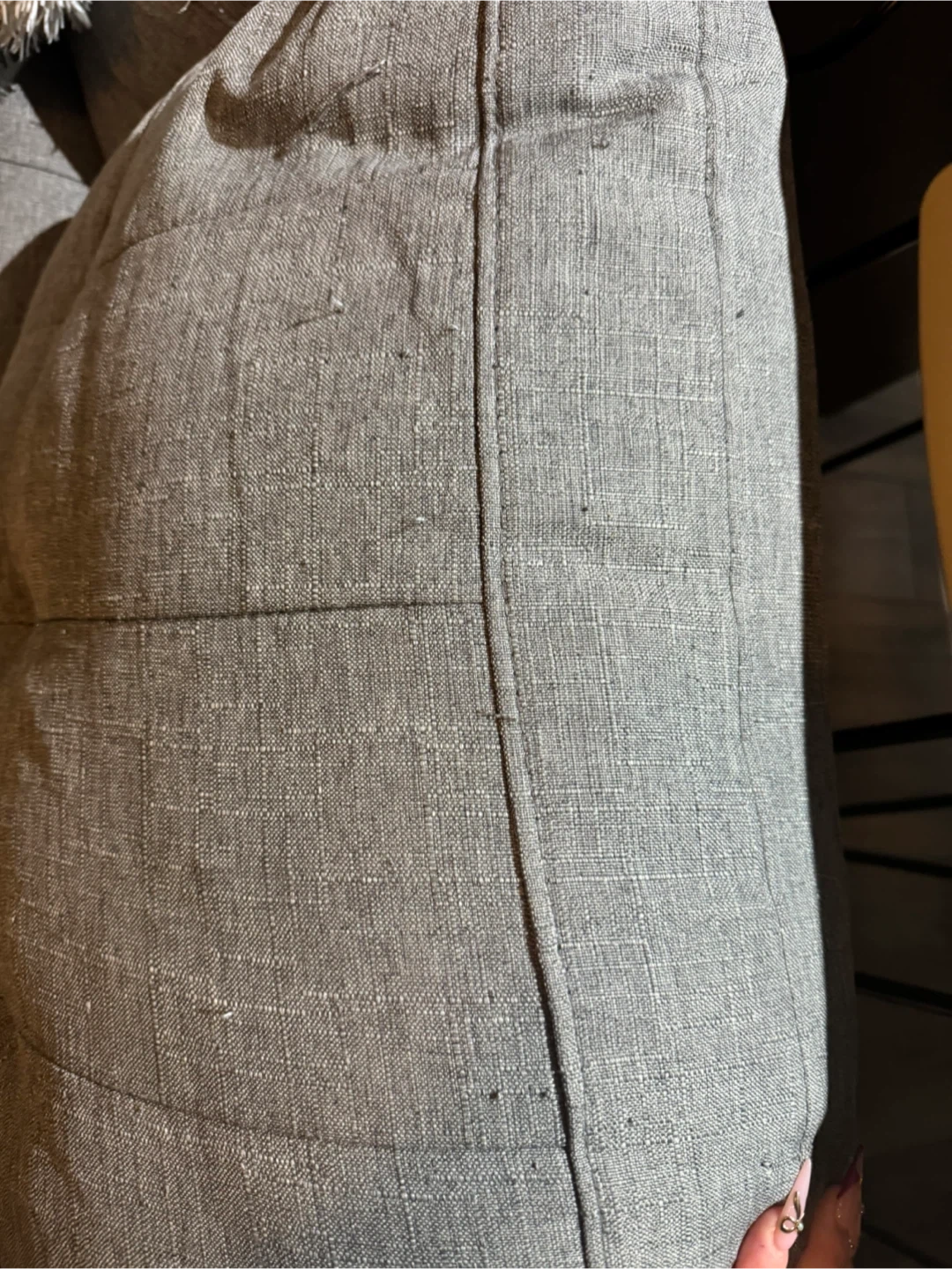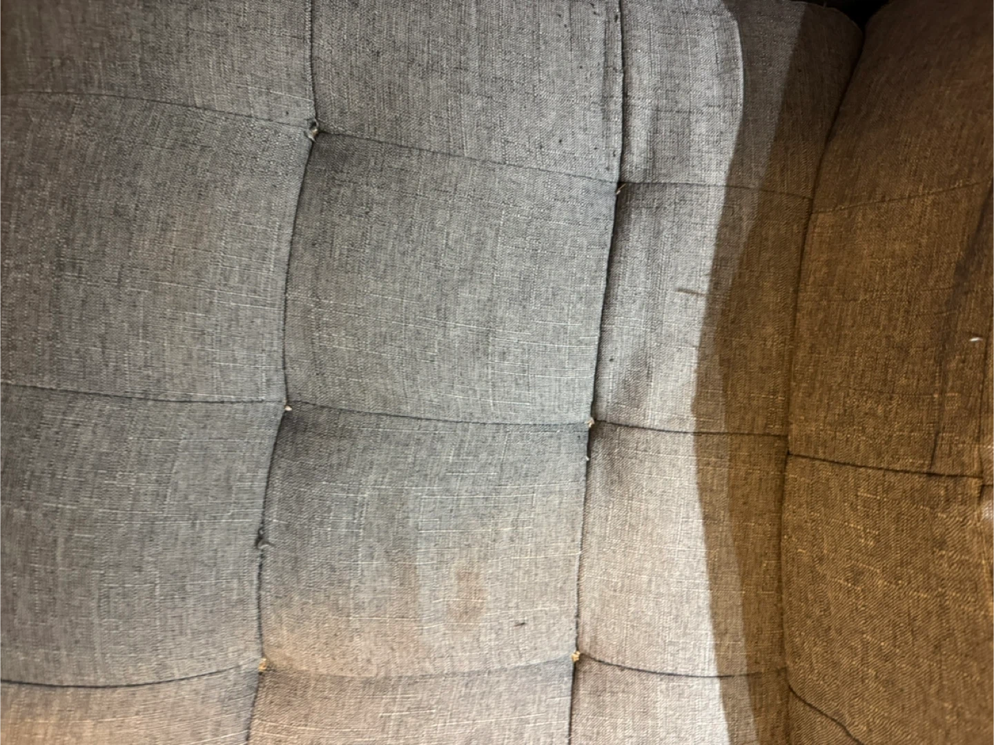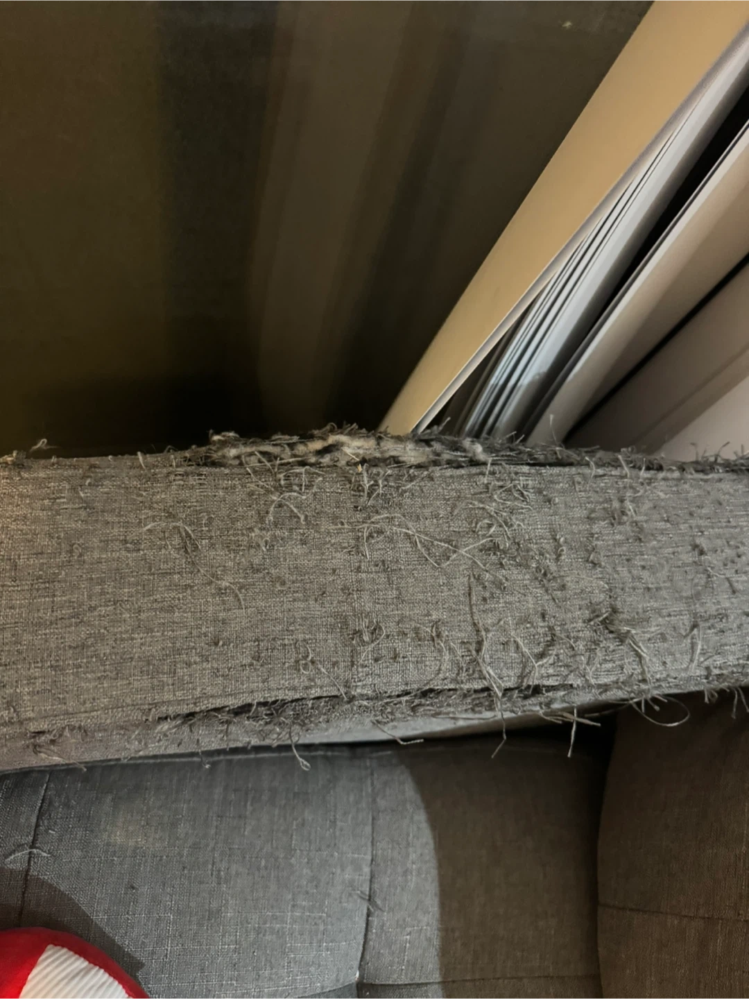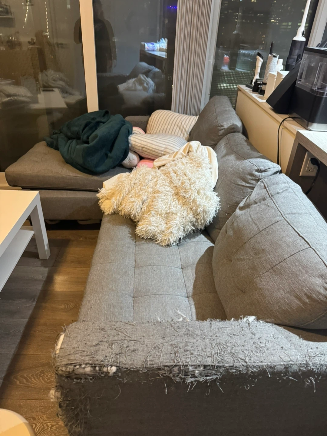 Selling a grey sofa for free, significant wear and tear from my cat. Pictures of tearing from claws can be seen in the photos provided.