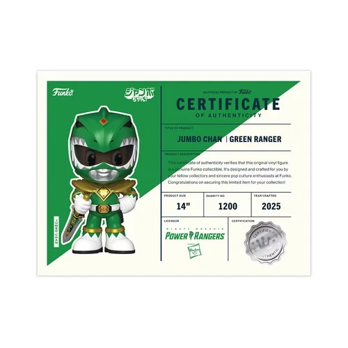 Sealed, never opened and comes with its original Funko shipping box which may have minimal signs of wear from shipping and handling. Born of Funko’s reverence and passion for retro Japanese toys, Jumbo Chan is designed to emulate the charm and vibrance of iconic characters that have inspired so many of our artists. This new collection merges feel-good nostalgia and sleek stylization of beloved licenses from the ‘60s, ‘70s, and ‘80s.Jumbo Chan collectibles feature exuberant expressions and vibrant colors as an ode to the original art, design, and stories of each character. Details in the sculptures mimic the joints of robotic and mecha heroes, an homage to the innovative, articulated toys. The packaging features bold lettering, burst icons, and full front-panel art.Jumbo Chan Mighty Morphin Power Rangers Green Ranger wields his Dragon Dagger and wears a suit of green with gold metallic details. Will he summon Dragonzord, or is he prepared to join other Power Rangers in the fight against evil? Either way, this legendary character is sure to bring adventure and excitement as a premium vinyl figure for your collection.Collectible Details:-Limited edition, only 1,200 produced.-14-inch-tall collectible.-Material: hard vinyl.-Includes a certificate of authenticity.-Collector’s box with eye-catching, full front-panel art.