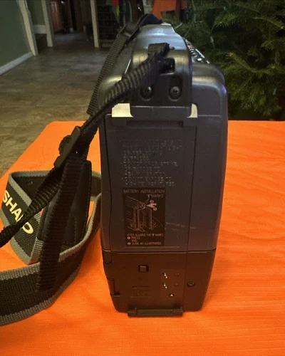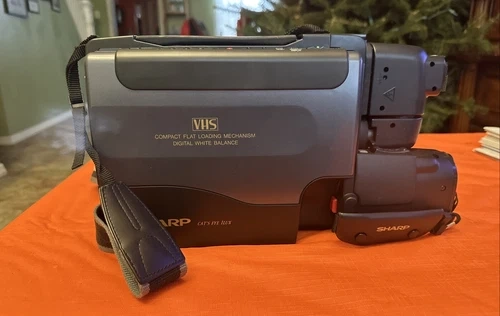 This is a Sharp VL-L72U Twin Slim Camcorder in black. It is a handheld device that records in standard definition on VHS tapes. The camcorder features a built-in microphone and connectivity options include component connections. The storage type is removable, and it is made in Japan. Please note that the battery is not included, and the item is untested and comes with: Camera, camera shoulder strap, protective lens cover, wires for tv connection, blank VHS tape, operation manual, and carrying case with shoulder straps. That is all.