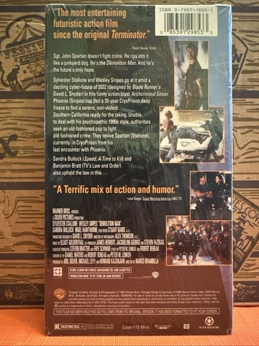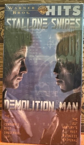 Dive into the action-packed world of "Demolition Man" with this brand-new, sealed VHS tape from Warner Bros. WB HITS collection. Featuring Sylvester Stallone and Wesley Snipes, and directed by Marco Brambilla, this sci-fi flick is sure to entertain. This VHS tape is in NTSC format and is rated R. Add this gem to your collection today!