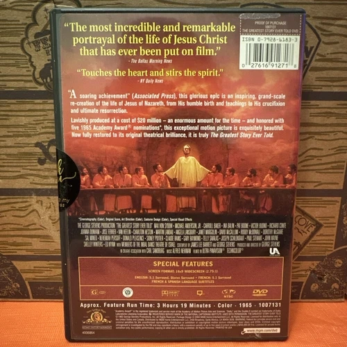 Casing may have some minimal signs of wear from handling and storage. DISC is in like new condition. This DVD, released in 1965, tells the story of the life, death, and resurrection of Jesus Christ. It features a talented cast, including Dorothy Dickie, Ross Martin, and Ina Balin, and was directed by George Stevens, David Lean, and Jean Negulesco. The film has a run time of 141 minutes and is rated G, making it appropriate for all audiences. The DVD is in English and covers the genre of drama, with a sub-genre of faith-based. This classic film is a must-see for anyone interested in the life of Jesus Christ and the history of Christianity.