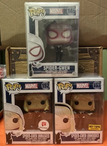 This lot includes three BRAND NEW Spider-Gwen Funko Pops, perfect for any Marvel fan. The figures feature the Unhooded, Unmasked, and regular Spider-Gwen designs, all made of high-quality vinyl material. These Pop! Vinyl collectibles are part of the Marvel S4 series and feature the box number 146, 152, and 153. These figures are all from the Spider-Verse and the greater Marvel universe. “Spider-Gwen #146, Spider-Gwen Unmasked #152, and Spider-Gwen Unhooded #153” are all included in this lot. #152 is a special Walmart exclusive and #153 is a Hot Topic exclusive making this lot a must have for collectors! The Spider-Gwen Funko Pops are a great addition to any collection, especially for those who love comics and boxing. These figures are part of the Marvel Collector Corps exclusive event/retailer and are vaulted, making them a rare find. Get your hands on these Funko Pops and showcase them in your collection!