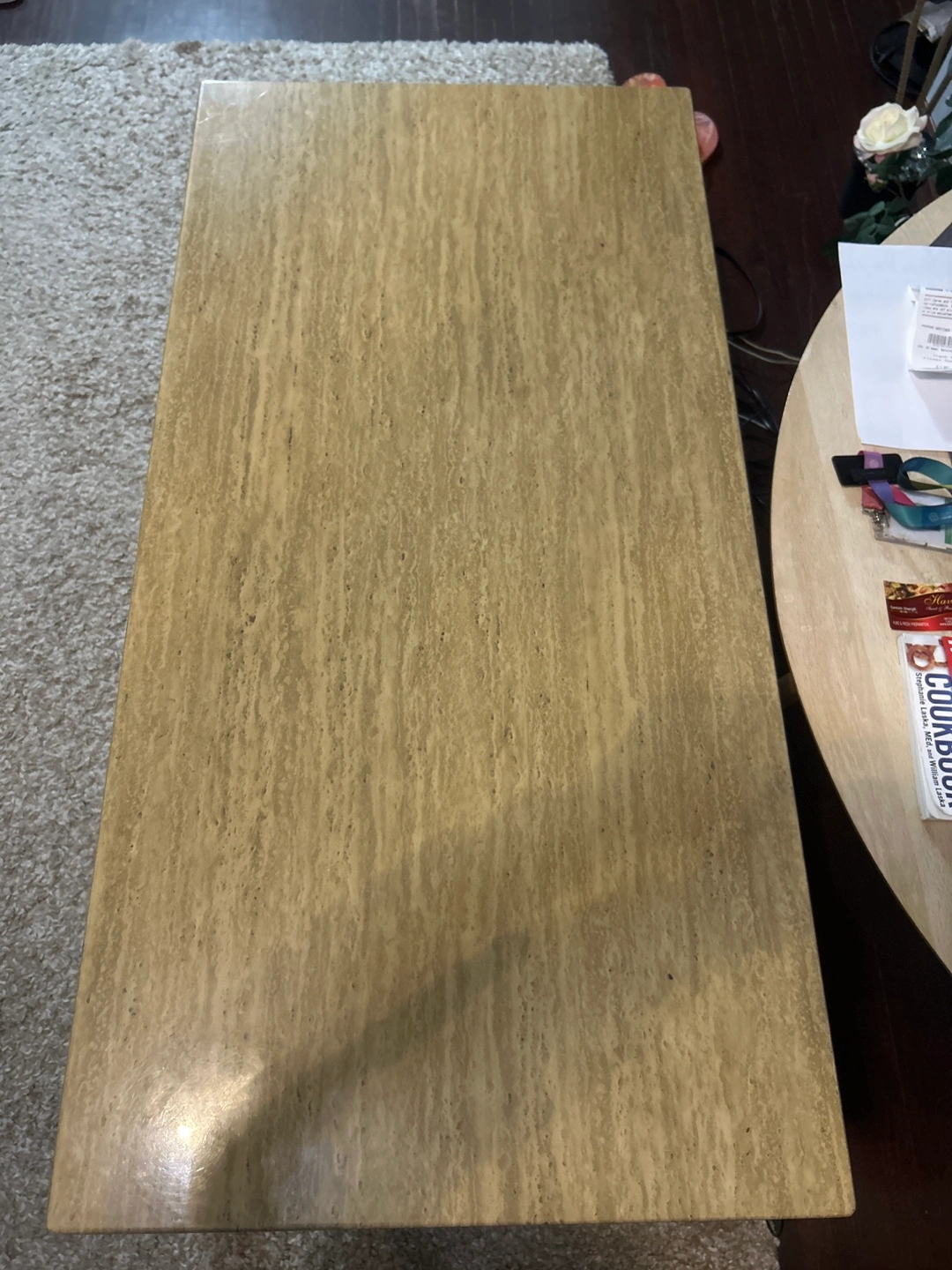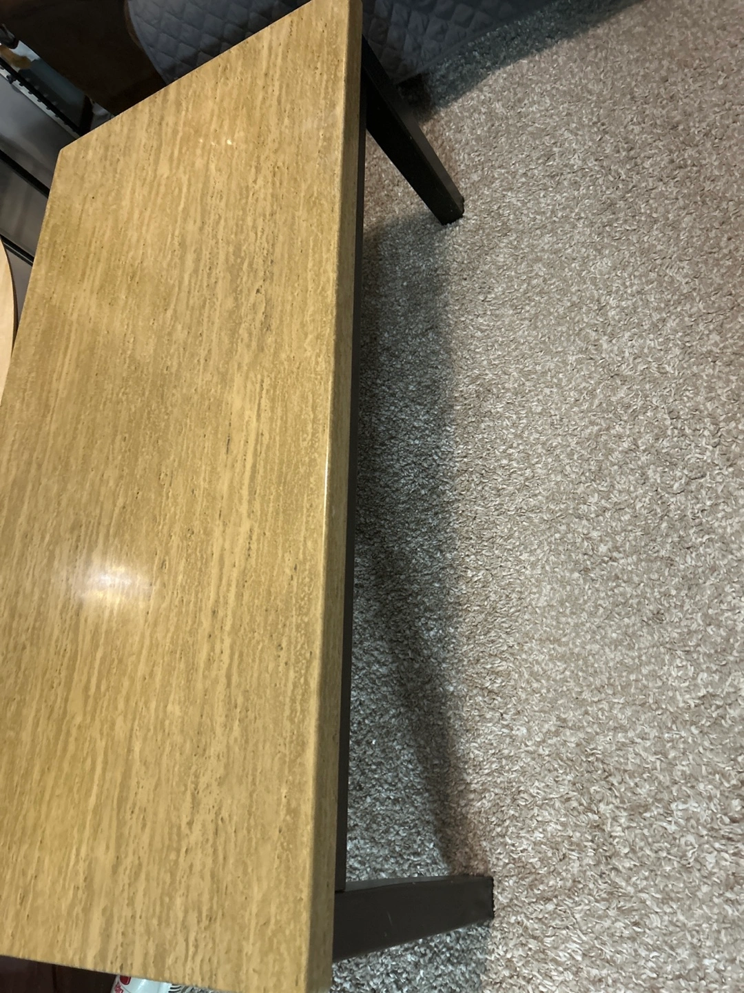 Large travertine coffee table and two side tables. Black legs. Neutral tones that fit seamlessly into any home decor.