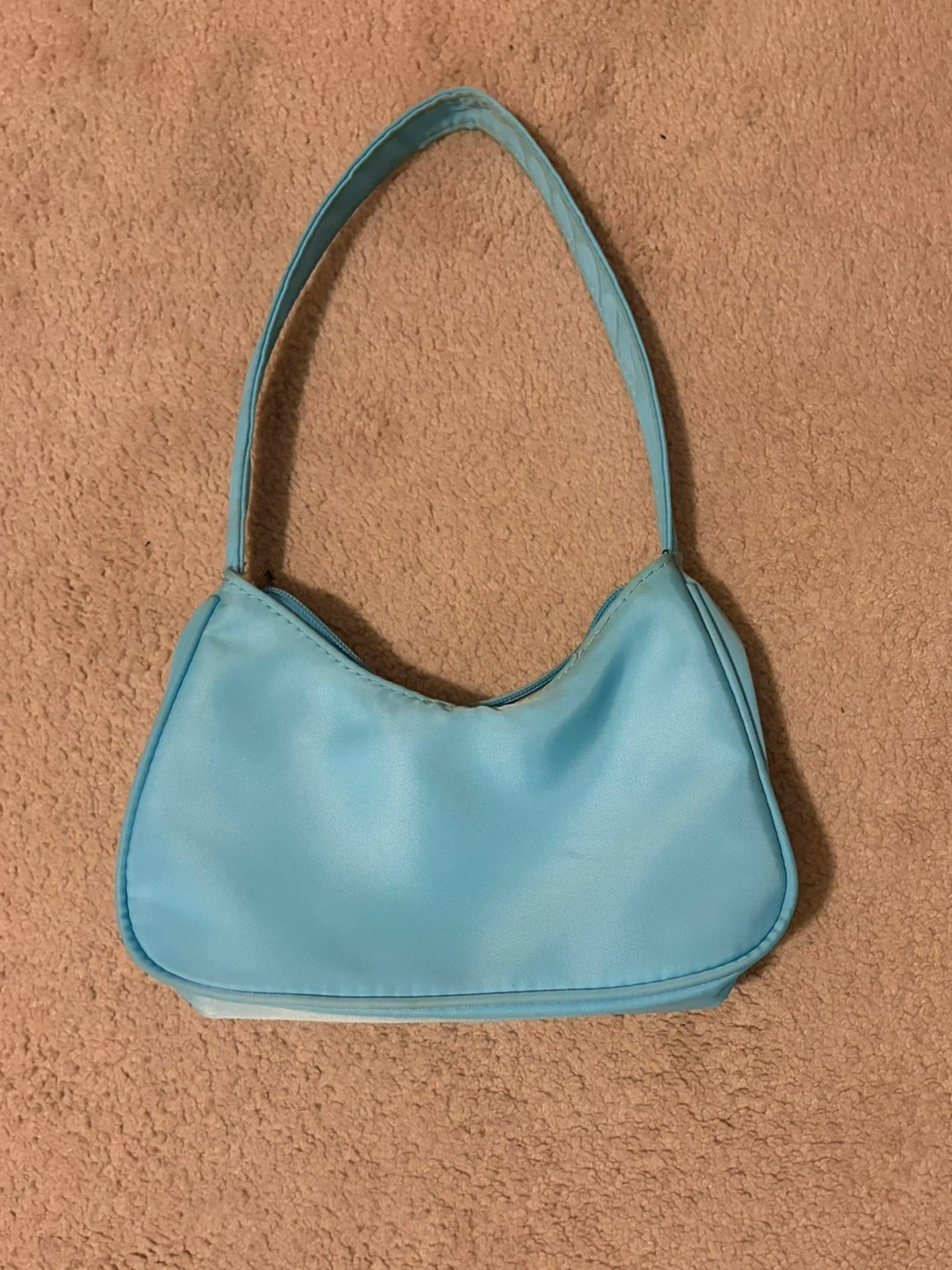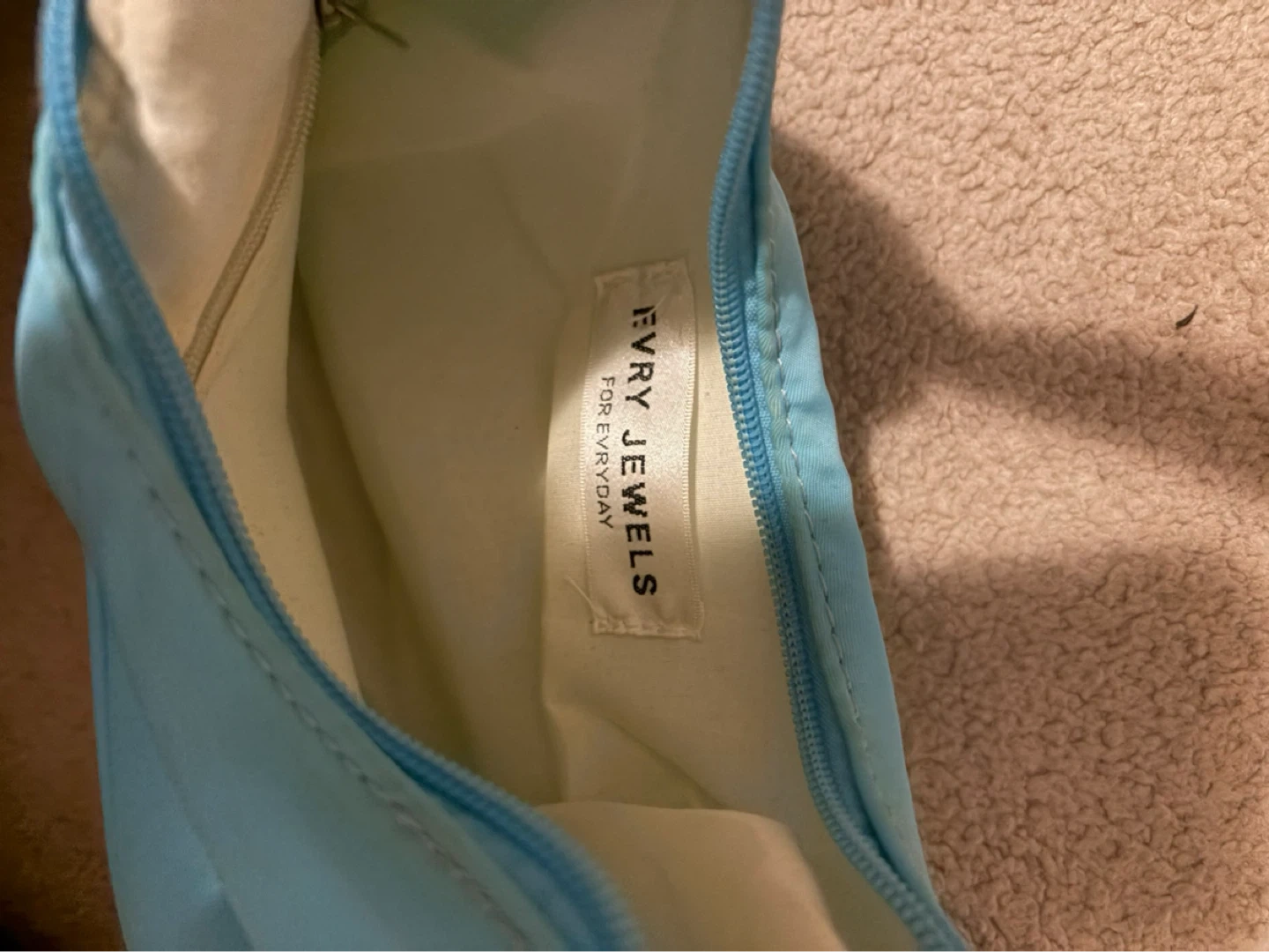 This light blue shoulder bag is from EVRY JEWELS, designed for everyday use. It features a zippered closure and a single strap. The interior lining is a creme.