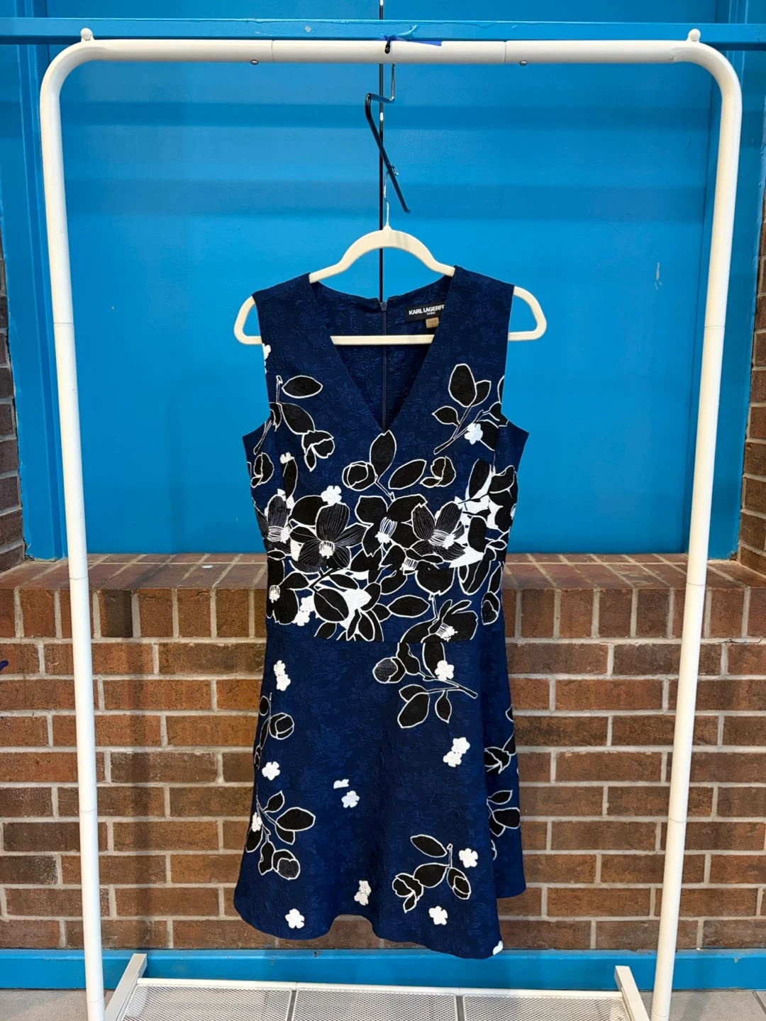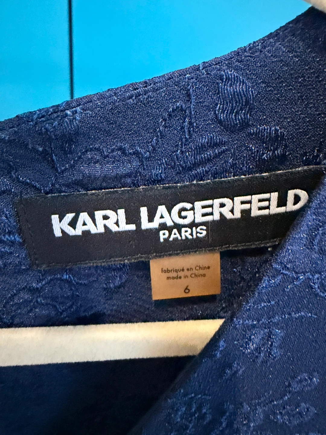 Selling a Karl Lagerfeld Paris dress in size 6. It's a beautiful navy blue colour with a floral pattern. Perfect for any occasion!