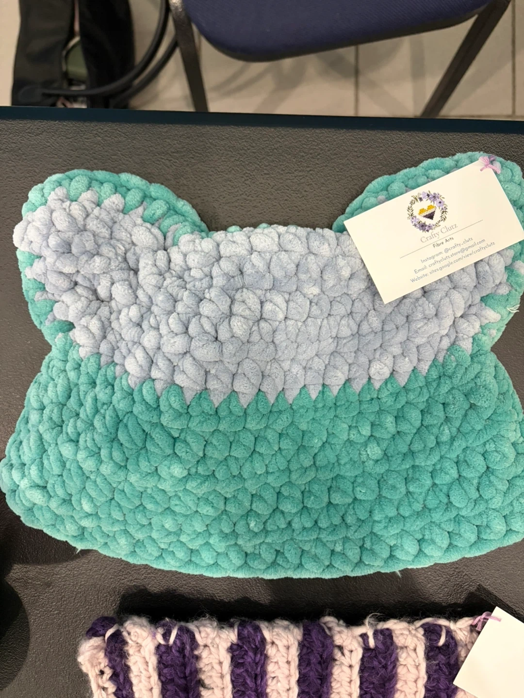 Check out this adorable handmade frog pillow from Crafty Clutz! It's a unique piece of fibre art. The pillow features a lovely combination of blue and green yarn, perfect for adding a touch of whimsy to any space