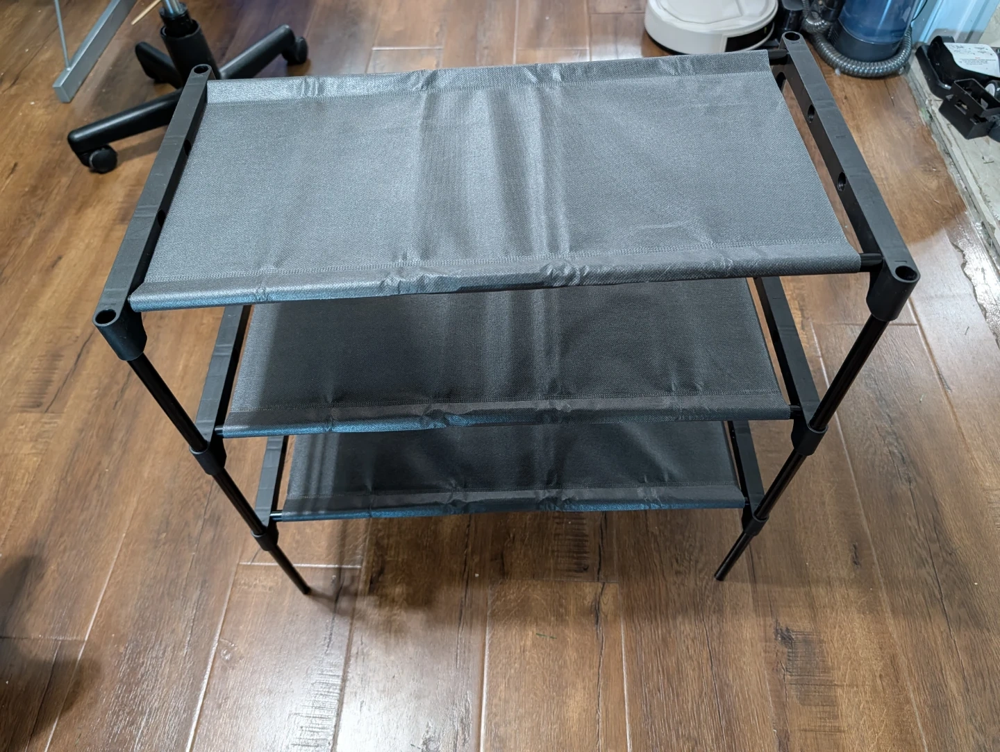 Selling a handy 3-tier shoe rack! It's perfect for keeping your entryway or closet organized. The rack is gray and made of a durable material. It's in great condition and ready to use!
