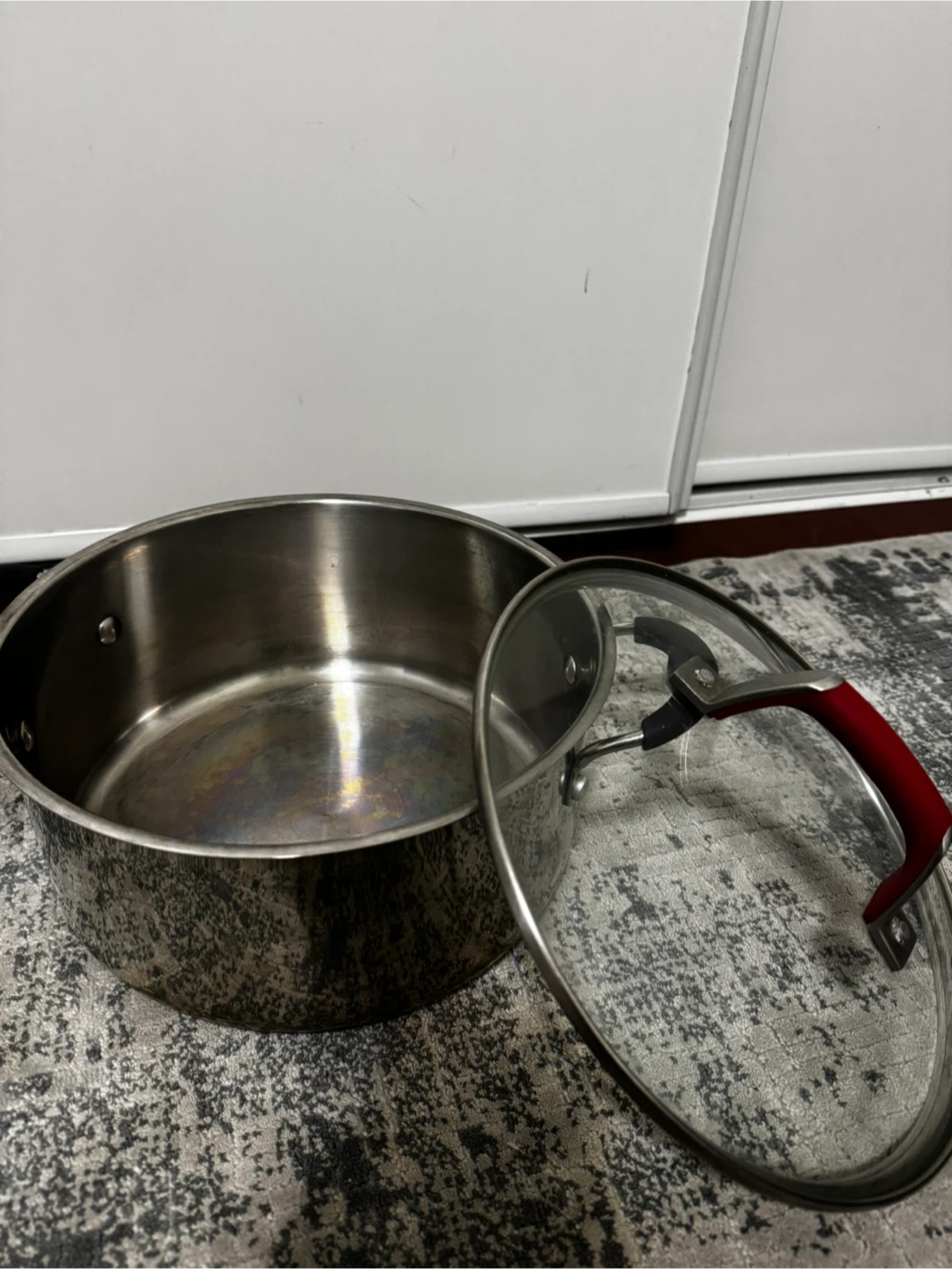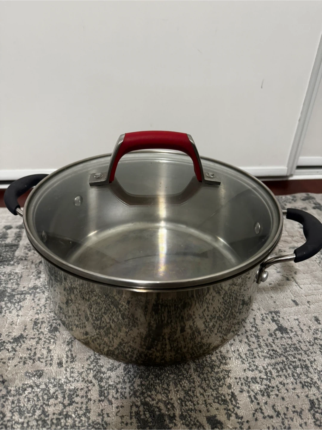Selling a stainless steel stock pot with a glass lid. It's in good condition and ready for a new kitchen! The pot has black handles and the lid has a red handle.