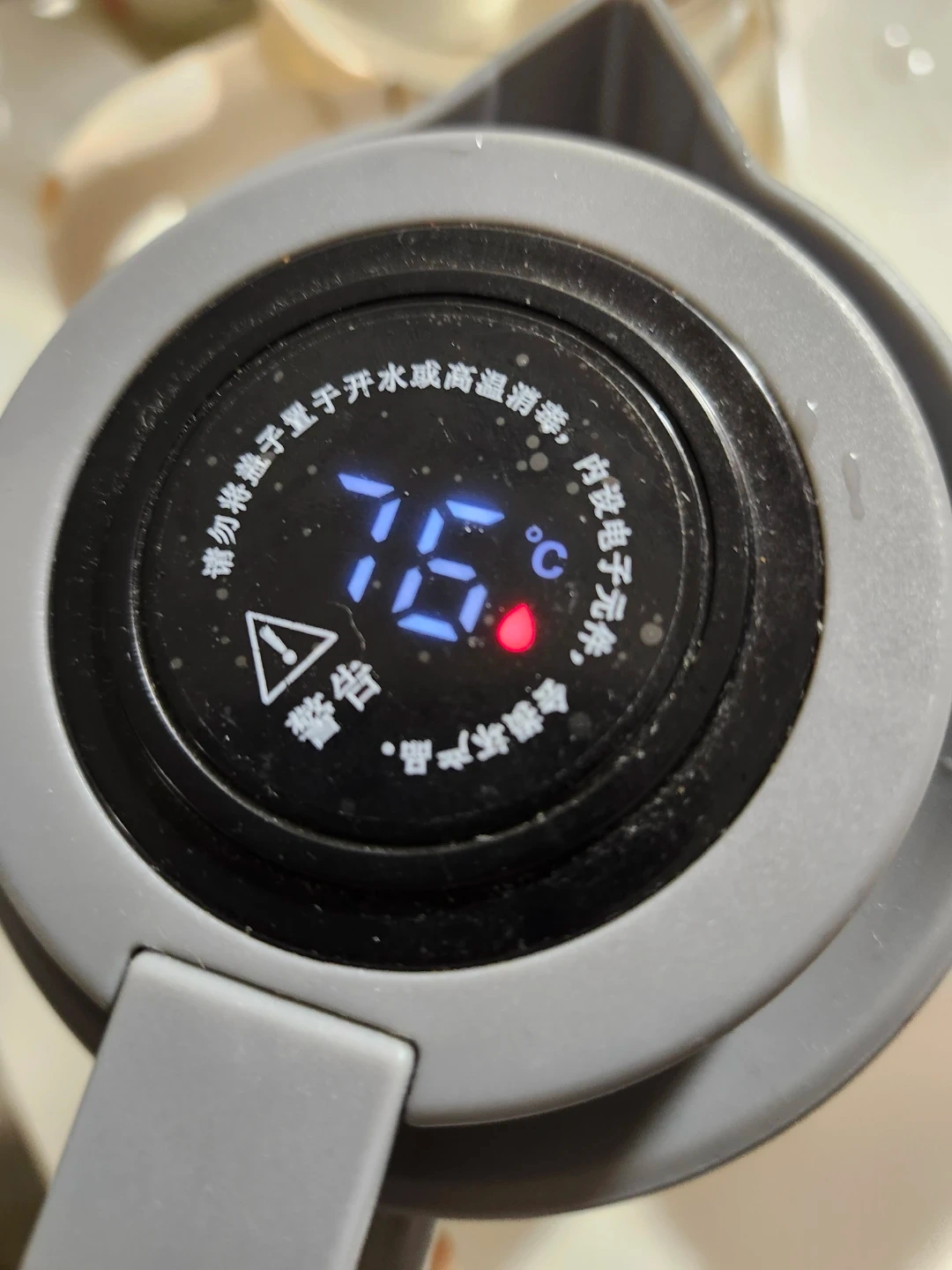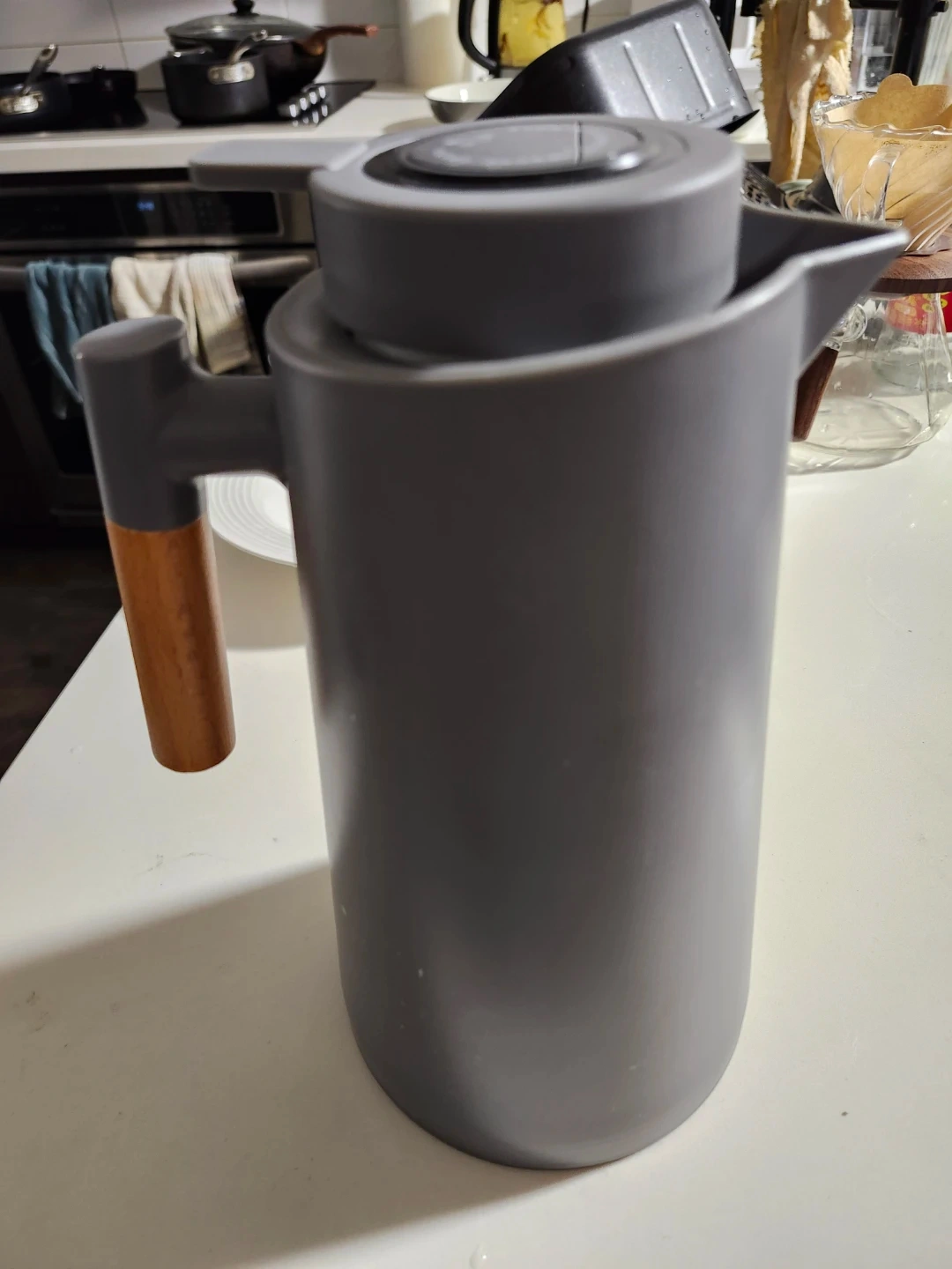 Selling a grey thermal carafe. It appears to be in good condition and would be perfect for keeping your beverages hot or cold. It has a wooden handle and a digital display showing the temperature inside