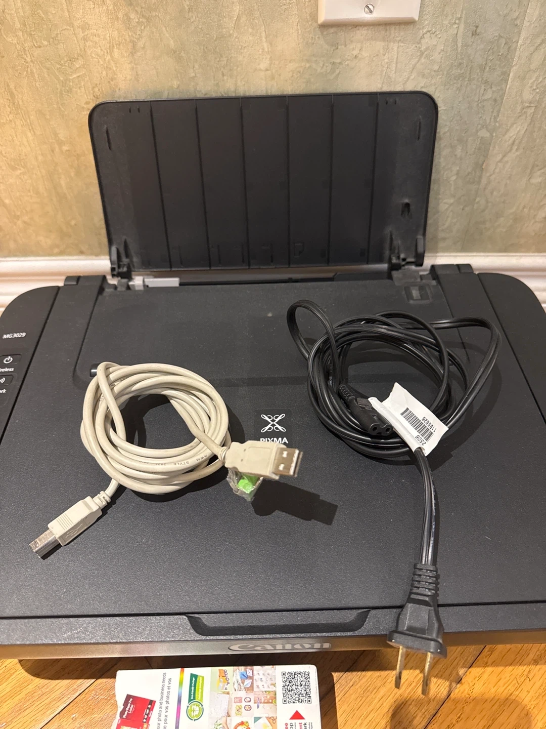 Selling a Canon MG3029 wireless/wired printer + scanner in good condition. It comes with some color and black ink preinstalled. Does NOT come with the two inks in the picture.