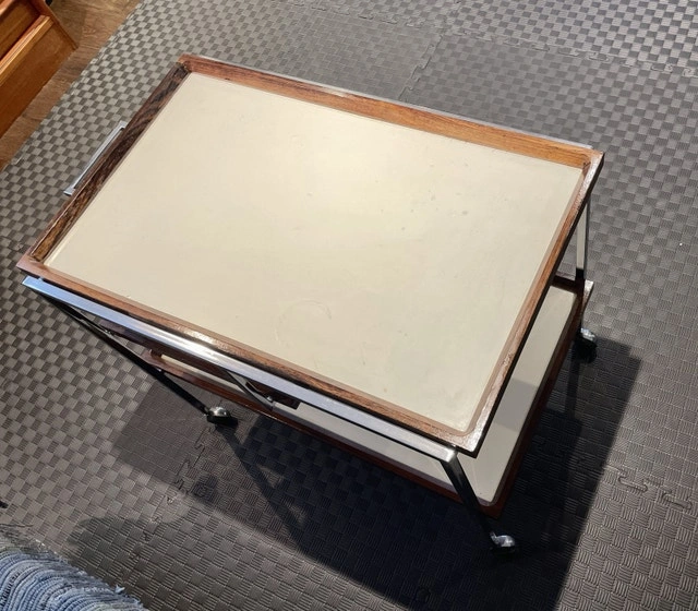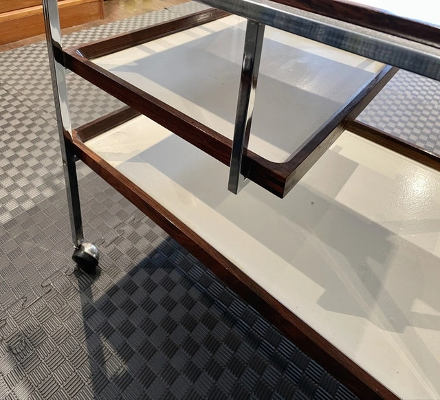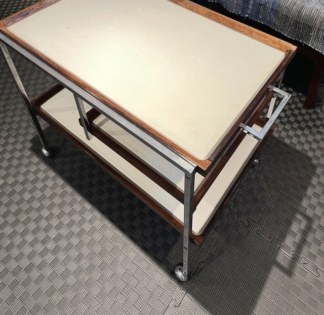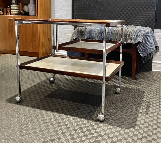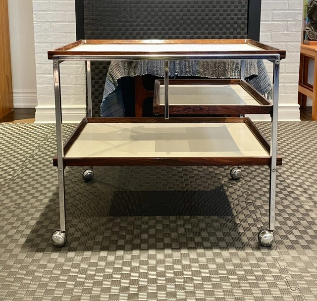 A mid-century modern gem! Georg Petersens Møbelfabrik Faurm Model 3520 Danish rolling service cart Chrome metal frame with rosewood-trimmed removable trays. Serious buyer only. Pick up only. Markham Rd and Highway7. Deposit to secure it. Price is firm.
