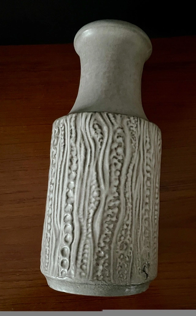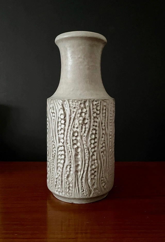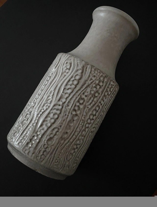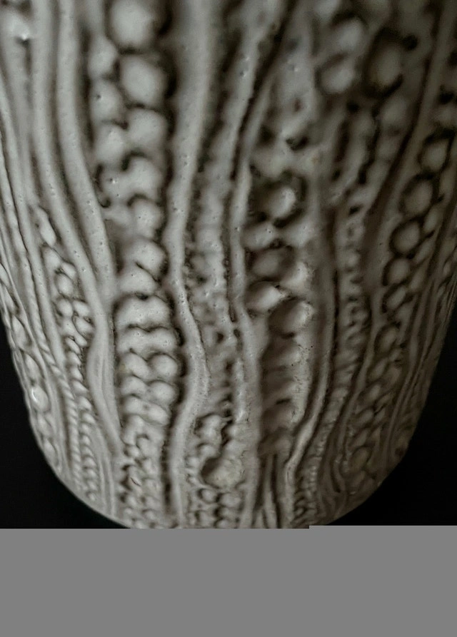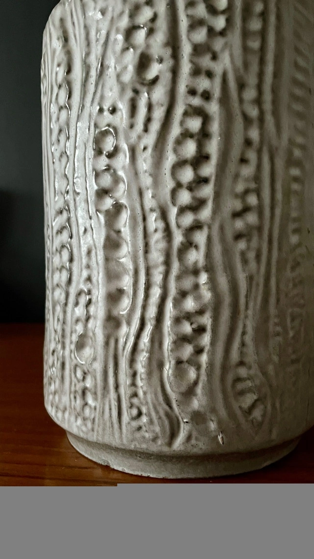 West Germany MCM “Reptile” Vase with Milk White Glaze Numbered 7350-30 Made by Carstens Tönnieshof. Gorgeous organic dimpled textured pattern designed by Dieter Peter for Carstens. It stands 30cm tall. There is a small chip on the rim of the bottom (see last pic)
